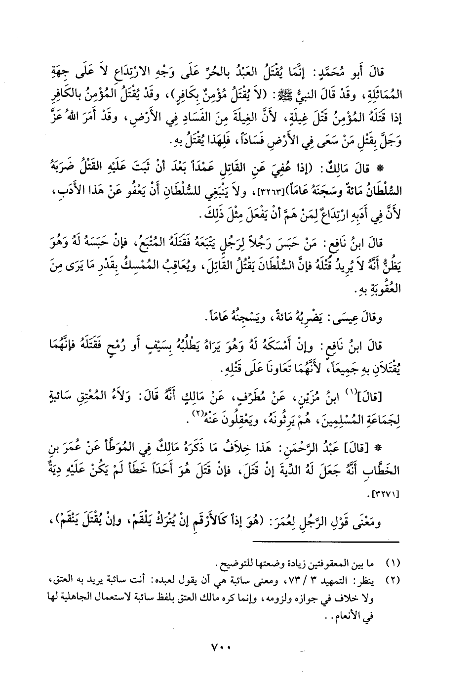 * قالَ مَالِكٌ: (إذا عُفِيَ عَنِ القَاتِلِ عَمْدَاً بَعْدَ أنْ ثَبَتَ عَلَيْهِ القَتْلُ ضَرَبَهُ السُّلْطَانُ مَائةً وسَجَنَهُ عَامَاً) [3263]، ولَا يَنْبَغِي للسُّلْطَانِ أَنْ يَعْفُو عَنْ هَذا الأَدَبِ، لأَنَّ فِي أَدَبِهِ ارْتدَاعٌ لِمَنْ هَمَّ أنْ يَفْعَلَ مِثْلَ ذَلِكَ.