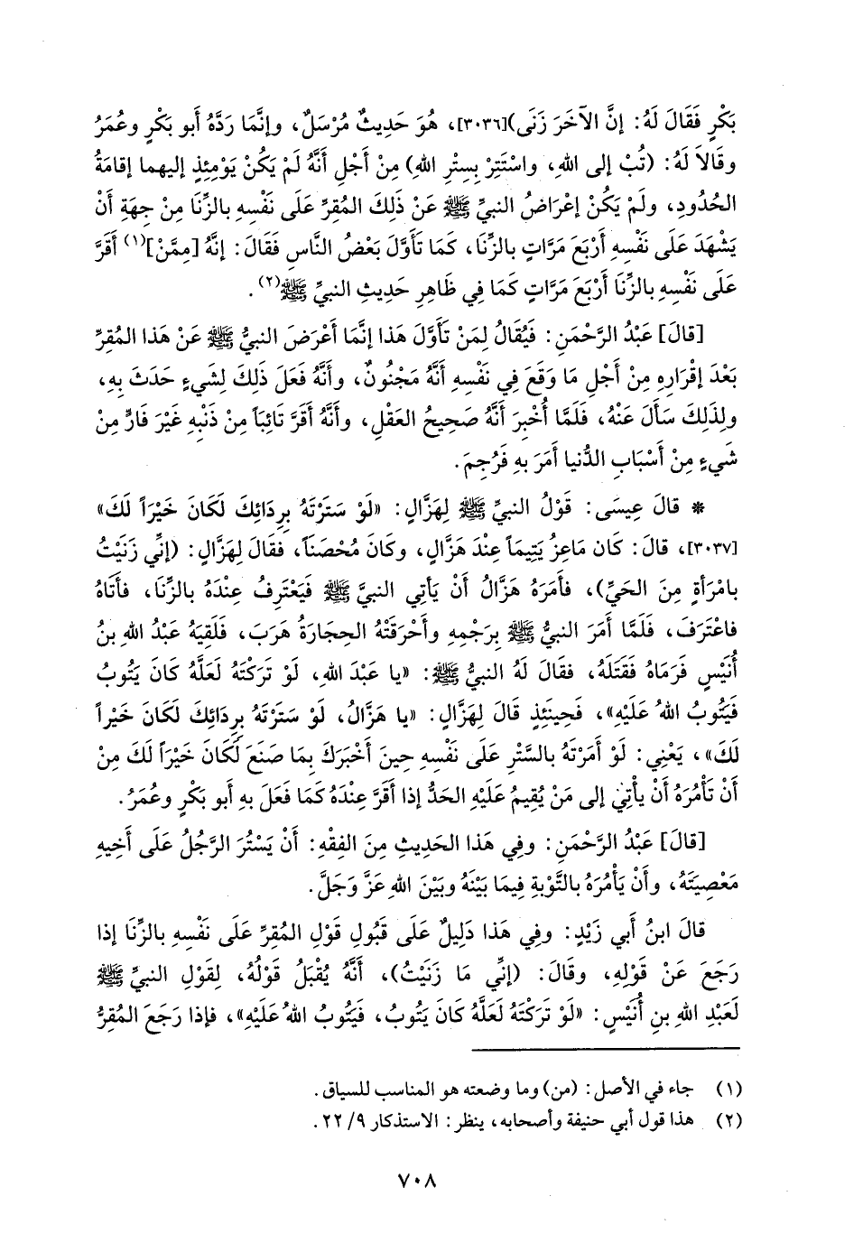 [قالَ] عَبْدُ الرَّحْمَنِ: فَيُقَالُ لِمَنْ تأَوَّلَ هَذا إنَّمَا أَعْرَضَ النبيُّ - صلى الله عليه وسلم - عَنْ هَذا المُقِرِّ بَعْدَ إقْرَارِهِ مِنْ أَجْلِ مَا وَقَعَ في نَفْسِهِ أَنَّهُ مَجْنُونٌ، وأَنَّهُ فَعَلَ ذَلِكَ لِشَيءٍ حَدَثَ بِهِ، ولِذَلِكَ سَأَلَ عَنْهُ، فَلَمَّا أُخْبِرَ أَنَّهُ صَحِيحُ العَقْلِ، وأَنَّهُ أَقَرَّ تَائِبًا مِنْ ذَنْبِهِ غَيْرَ فَارٍّ مِنْ شَيءٍ مِنْ أَسْبَابِ الدُّنيا أَمَرَ بهِ فَرُجِمَ.