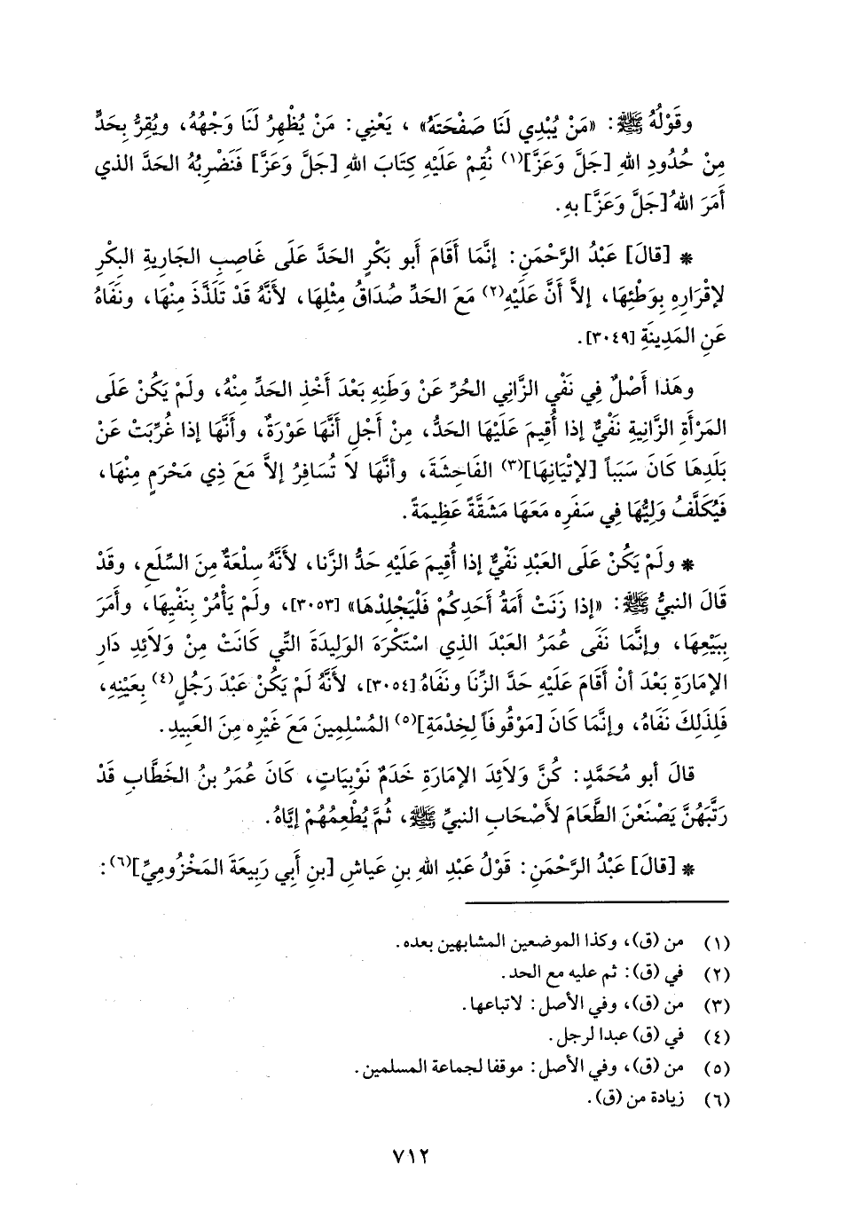 * ولَمْ يَكُنْ عَلَى العَبْدِ نَفْي إذا أُقِيمَ عَلَيْهِ حَدُّ الزَّنا، لَأَنَّةُ سِلْعَة مِنَ السِّلَعِ، وقَدْ قَالَ النبي - صلى الله عليه وسلم -: "إذا زَنَتْ أَمَةُ أَحَدِكمْ فَلْيَجْلِدْهَا" [3053] , ولَمْ يَأْمُرْ بِنَفْيِهَا، وأَمَرَ بِبَيْعِهَا، وَإِنَّمَا نَفَى عُمَرُ العَبْدَ الذِي اسْتَكْرَهَ الوَليدَةَ الَّتي كَانَتْ مِنْ وَلَائِدِ دَارِ الإمَارَةِ بَعْدَ أنْ أَقَامَ عَلَيْهِ حَدَّ الزِّنَا ونَفَاهُ [3054] , لأَنَّهُ لَمْ يَكُنْ عَبْدَ رَجُلٍ (¬4) بِعَيْنِهِ، فَلِذَلِكَ نَفَاهُ، وإنَّمَا كَانَ [مَوْقُوفًا لِخِدْمَةِ] (¬5) المُسْلِمِينَ مَعَ غَيْرِه مِنَ العَبِيدِ.