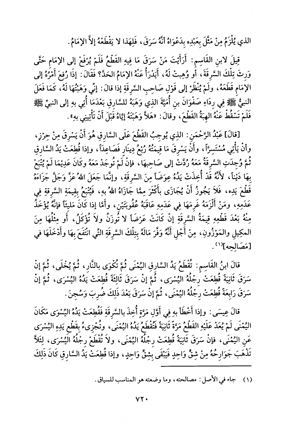 قالَ ابنُ القَاسِمِ: تُقْطَعُ يَدُ السَّارِقِ اليُمْنَى ثُمَّ تُكْوَى بالنَّارِ، ثُمَّ يُخْلَى، ثُمَّ إنْ سَرَقَ ثَانِيَة قُطِعَتْ رِجْلُهُ اليُسْرَى، ثُمَّ إنْ سَرَقَ ثَالِثَةً قُطِعَتْ يَدُهُ اليُسْرَى، ثُمَّ إنْ سَرَقَ رَابِعَة قُطِعَتْ رِجْلُهُ اليُمْنَى، ثُمَّ إنْ سَرَقَ بَعْدَ ذَلِكَ ضُرِبَ وَسُجِنَ.