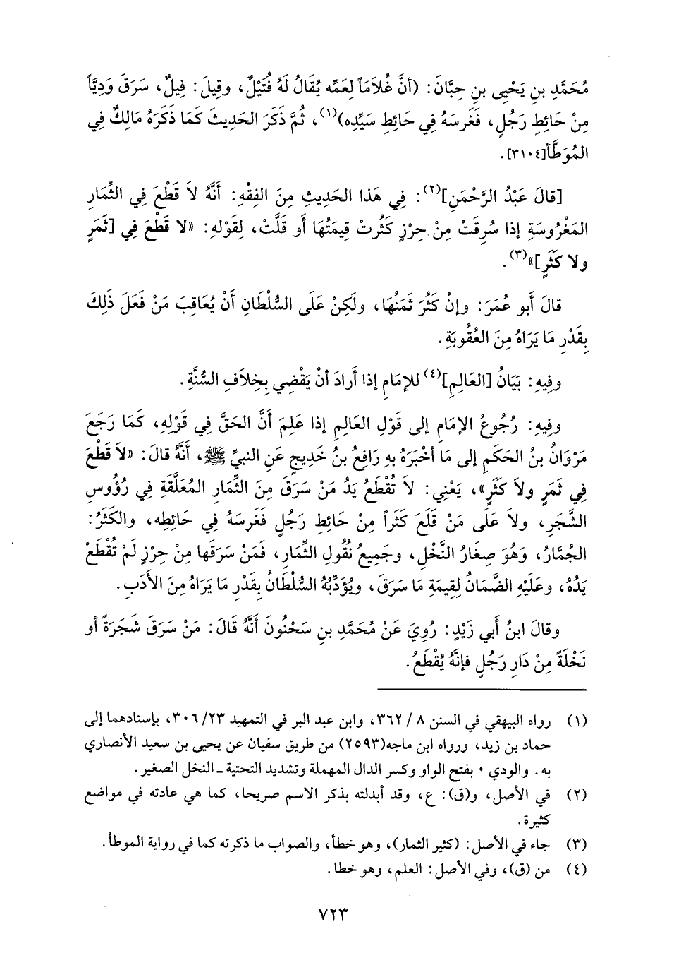 [قالَ عَبْدُ الرَّحْمَنِ] (¬2): في هَذا الحَدِيثِ مِنَ الفِقْهِ: أَنَّهُ لا قَطْعَ في الثِّمَارِ المَغْرُوسَةِ إذا سُرِقَتْ مِنْ- حِرْزٍ كَثُرتْ قِيمَتُهَا أَو قَلَّتْ، لِقَوْلهِ: "لا قَطعَ في [ثَمَرٍ ولا كثَرٍ] " (¬3).