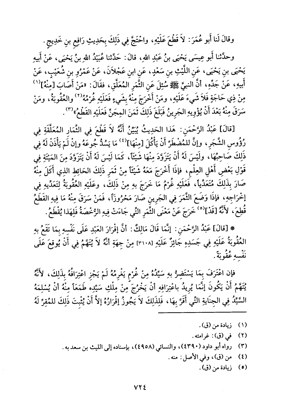 [قال] عَبْدُ الرَّحْمَنِ: هَذا الحَدِيثُ يُبَيِّنُ أَنَّهُ لا قَطْعَ في الثِّمَارِ المُعَلَّقَةِ في رُؤُوسِ الشَّجَرِ، وإنَّ للمُضْطَرّ أَنْ يَأْكُلَ [مِنْهَا] (¬4) مَا يَسُدُّ جُوعَهُ وإنْ لَمْ يَأْذَنْ لَهُ في ذَلِكَ صَاحِبُهَا, ولَيْسَ لَهُ أَنْ يَتَزَوَّدَ مِنْهَا شَيْئًا، كَمَا لَيْسَ لَهُ أَنْ يَتَزَوَّدَ مِنَ المَيْتَةِ في قَوْلِ بَعْضِ أَهْلِ العِلْمِ، فإذَا أَخْرَجَ مَعَهُ شَيْئَا مِنْ ثَمَرِ ذَلِكَ الحَائِطِ الذِي أَكَلَ مِنْهُ صَارَ بِذَلِكَ مُتَعَدِّيا، فَعَلَيْهِ غُرْمُ مَا خَرَجَ بهِ مِنْ ذَلِكَ، وعَلَيْهِ العُقُوبَةُ لِتَعَدّيهِ في إخْرَاجهِ، فإذَا وَضَعَ الثمَرَ في الجَرِينِ صَارَ مَحْرُوزًا، فَمَنْ سَرَقَ مِنْهُ مَا فِيهِ القَطَعُ قُطِعَ، لأَنَّهُ [قَدْ] (¬5) خَرَجَ عَنْ مَعْنَى الثَّمَرِ التّي جَاءَتْ فِيهِ الرُّخْصَةُ فَلِهَذا يُقْطَعُ.