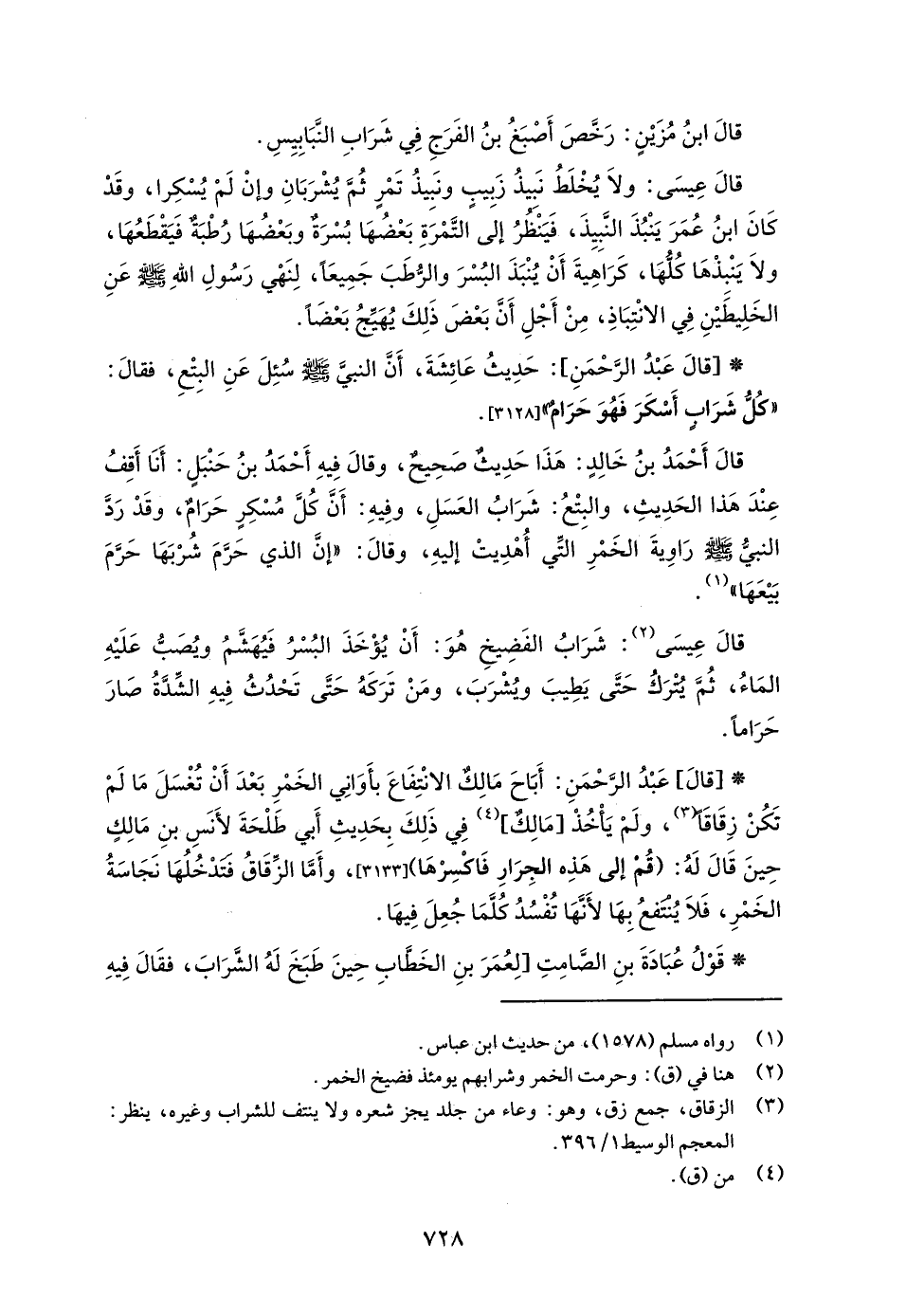 قالَ عِيسَى: ولَا يُخْلَطُ نَبيذُ زَبِيبٍ ونَبيذُ تَمْرٍ ثُمَّ يُشْرَبَانِ وإنْ لَمْ يُسْكِرا، وقَدْ كَانَ ابنُ عُمَرَ يَنْبُذَ النَّبيِذَ، فَيَنْظُرُ إلى التَمْرَةِ بَعْضُهَا بُسْرَةٌ وبَعْضُهَا رُطْبَةٌ فَيَقْطَعُهَا، ولَا يَنْبذْهَا كُلُّهَا، كَرَاهِيةَ أَنْ يُنْبَذَ البُسْرَ والرُّطَبَ جَمِيعًا، لِنَهْى رَسُولِ اللهِ - صلى الله عليه وسلم - عنِ الخَلِيطَيْنِ في الإنْتِبَاذِ، مِنْ أَجْلِ أَنَّ بَعْضَ ذَلِكَ يُهَيِّجُ بَعْضًا.