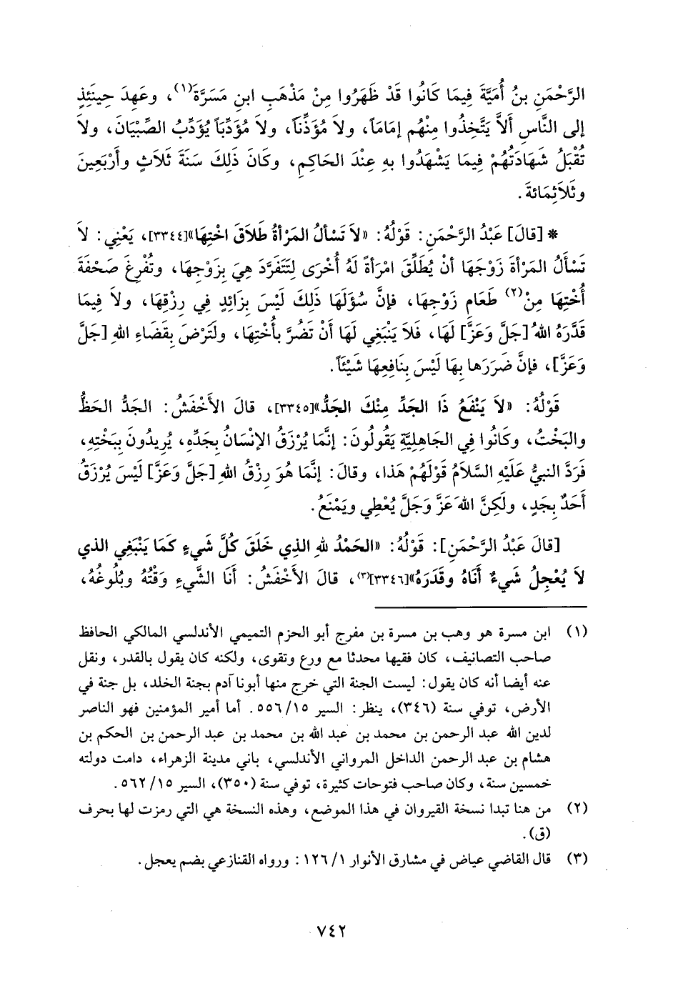 (¬1) ابن مسرة هو وهب بن مسرة بن مفرج أبو الحزم التميمي الأندلسي المالكي الحافظ صاحب التصانيف، كان فقيهًا محدثا مع ورع وتقوى، ولكنه كان يقول بالقدر، ونقل عنه أيضًا أنه كان يقول: ليست الجنة التي خرج منها أبونا آدم بجنة الخلد، بل جنة في الأرض، توفي سنة (346)، ينظر: السير 15/ 556. أما أمير المؤمنين فهو الناصر لدين الله عبد الرحمن بن محمد بن عبد الله بن محمد بن عبد الرحمن بن الحكم بن هشام بن عبد الرحمن الداخل المرواني الأندلسي، باني مدينة الزهراء، دامت دولته خمسين سنة، وكان صاحب فتوحات كثيرة، توفي سنة (350)، السير 15/ 562.