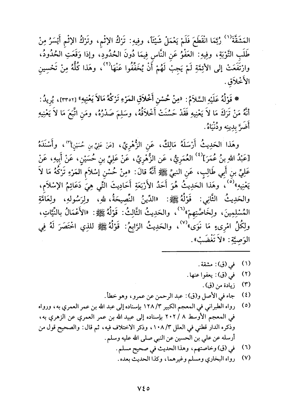 وهَذا الحَدِيثُ أَرْسَلَهُ مَالِكٌ، عَنِ الزُّهْرِيِّ، [عَنْ عَلِيُّ بنِ حُسَيْنٍ] (¬3)، وأَسْنَدَهُ [عَبْدُ اللهِ بنُ عُمَرَ] (¬4) العُمَرِيُّ، عَن الزُّهْرِيِّ، عَنْ عَلِيِّ بنِ حُسَيْنٍ، عَنْ أَبِيهِ، عَنْ عَلِيِّ بن أَبِي طَالِبٍ، عَنِ النبيِّ - صلى الله عليه وسلم - أنَّهُ قالَ: "مِنْ حُسْنِ إسْلَامِ المَرْءِ تَرْكُهُ مَا لا يَعْنِيهِ" (¬5)، وهَذا الحَدِيثُ هُوَ أَحَدُ الأَرْبَعَةِ أَحَادِيثَ الَّتي هِيَ دَعَائِمُ الإسْلَامِ، والحَدِيثُ الثَّانِي: قَوْلُهُ - صلى الله عليه وسلم -: "الدِّينُ النِّصِيحَةُ، للهِ، ولِرَسُولهِ، ولِعَامَّةِ المُسْلِمِينَ، ولِخَاصَّتِهِمْ" (¬6)، والحَدِيثُ الثَّالِثُ: قَوْلُهُ - صلى الله عليه وسلم -: "الأَعْمَالُ بالنّيَّاتِ، ولِكُلِّ امْرِيٍّ مَا نَوَى" (¬7)، والحَدِيثُ الرابع: قَوْلُهُ - صلى الله عليه وسلم - للذِي اخْتَصَرَ لَهُ في الوَصِيَّةِ: "لا تَغْضَبْ".