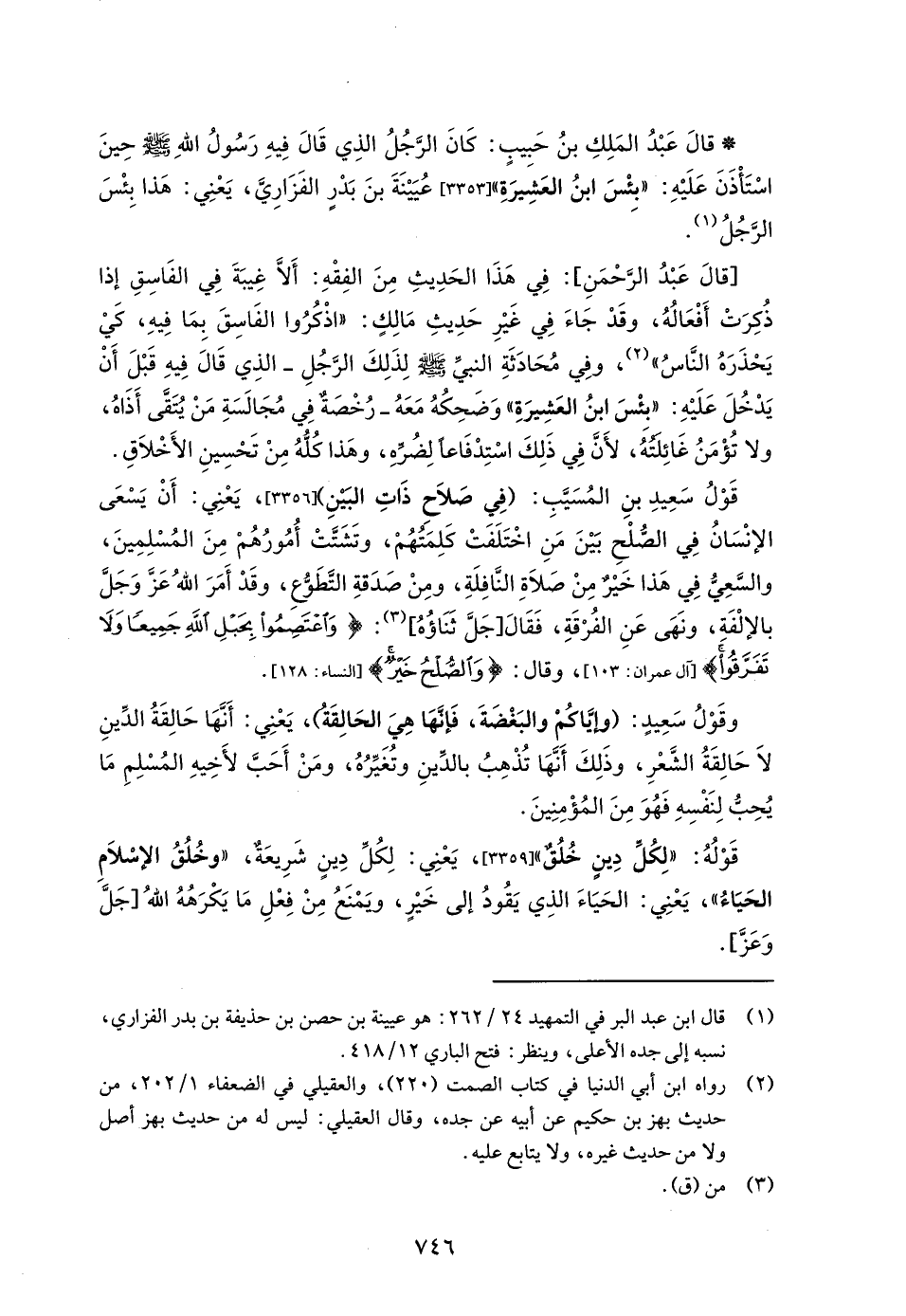 قَوْلُ سَعِيدِ بنِ المُسَيَّبِ: (في صَلَاحِ ذَاتِ البَيْنِ) [3356] , يَعْنِي: أَنْ يَسْعَى الإنْسَانُ في الصُّلْحِ بَيْنَ مَنِ اخْتَلَفَتْ كَلِمَتُهُمْ، وتَشَتَّتْ أُمُورُهُمْ مِنَ المُسْلِمِينَ، والسَّعِيّ في هَذا خَيْر مِنْ صَلَاةِ النَّافِلَةِ، ومِنْ صَدَقةِ التَّطَوّعِ، وقَدْ أَمَرَ اللهُ -عَزَّ وَجَلَّ- بالإلْفَةِ، ونَهَى عَنِ الفُرْقَةِ، فَقَالَ [جَلَّ ثَنَاؤُهُ] (¬3): {وَاعْتَصِمُوا بِحَبْلِ اللهِ جَمِيعًا وَلَا تَفَرَّقُوا} [آل عمران: 103] , وقال: {وَالصُّلْحُ خَيْرٌ} [النساء: 128].