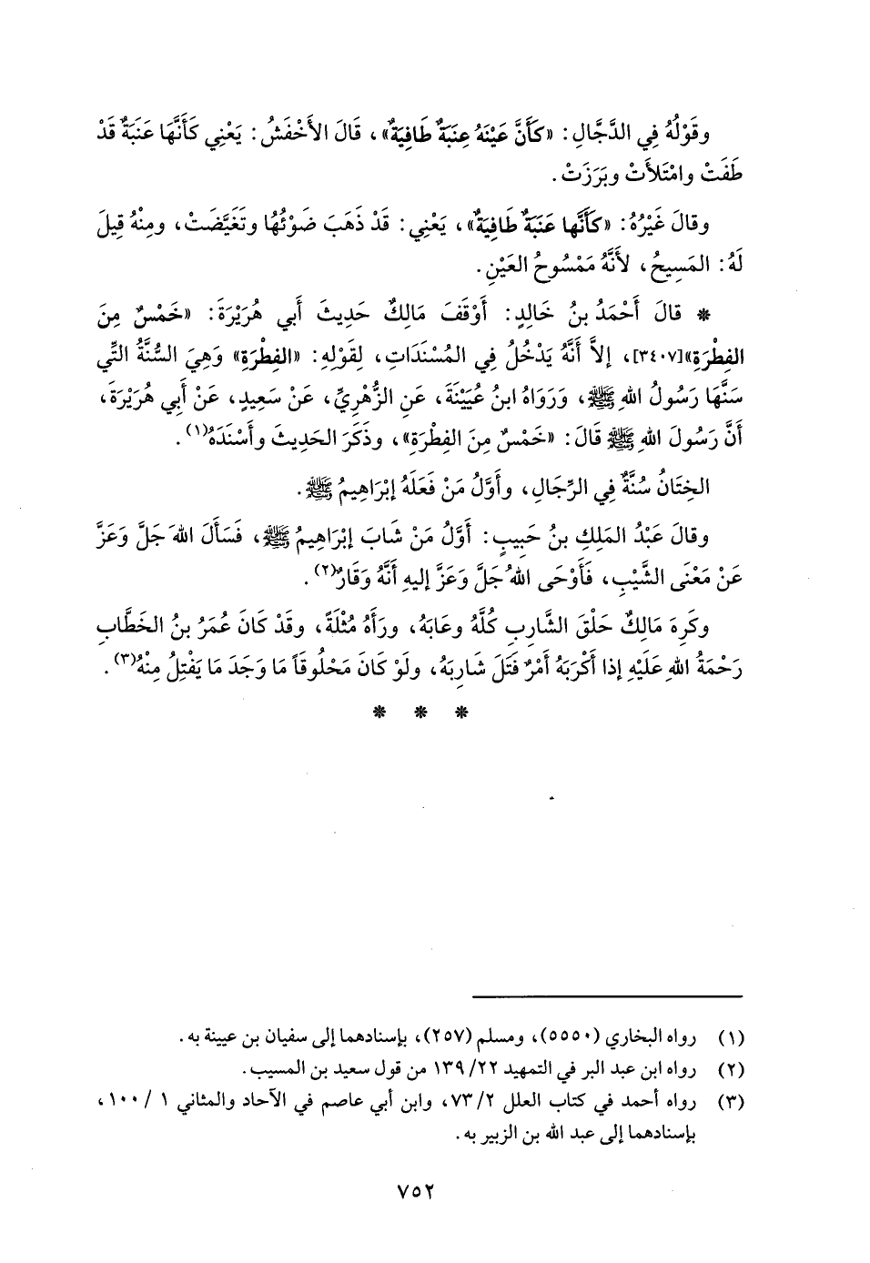 * قالَ أَحْمَدُ بنُ خَالِدٍ: أَوْقَفَ مَالِكٌ حَدِيثَ أَبي هُرَيْرَةَ: "خَمسٌ مِنَ الفِطْرَةِ"، إلَّا أَنَّهُ يدخلُ في المُسْنَدَاتِ، لِقَوْلهِ: "الفِطْرَةِ" وَهِيَ السُّنَّةُ الَّتي سَنَّهَا رَسُولُ اللهِ - صلى الله عليه وسلم -، وَرَوَاهُ ابنُ عُيَيْنَةَ، عَنِ الزُّهْرِيِّ، عَنْ سَعِيدٍ، عَنْ أَبِي هُرَيْرَةَ، أَنَّ رَسُولَ اللهِ - صلى الله عليه وسلم - قَالَ: "خَمْسٌ مِنَ الفِطْرَةِ"، وذَكَرَ الحَدِيثَ وأَسْنَدَهُ (¬1).