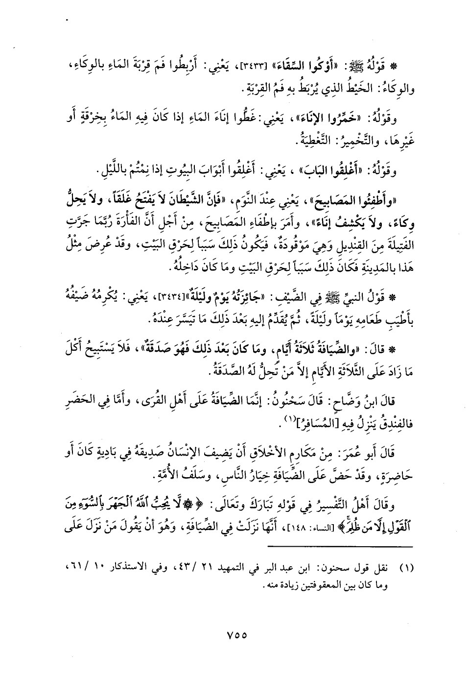 قَالَ أَبو عُمَرَ: مِنْ مَكَارِم الأخْلاَقِ أَنْ يَضِيفَ الإنْسَانُ صَدِيقَهُ في بَادِيةٍ كَانَ أَو حَاضِرَةٍ، وقَدْ حَضَّ عَلَى الضِّيَافَةِ خِيَارُ النَّاسِ، وسَلَفُ الأُمَّةِ.