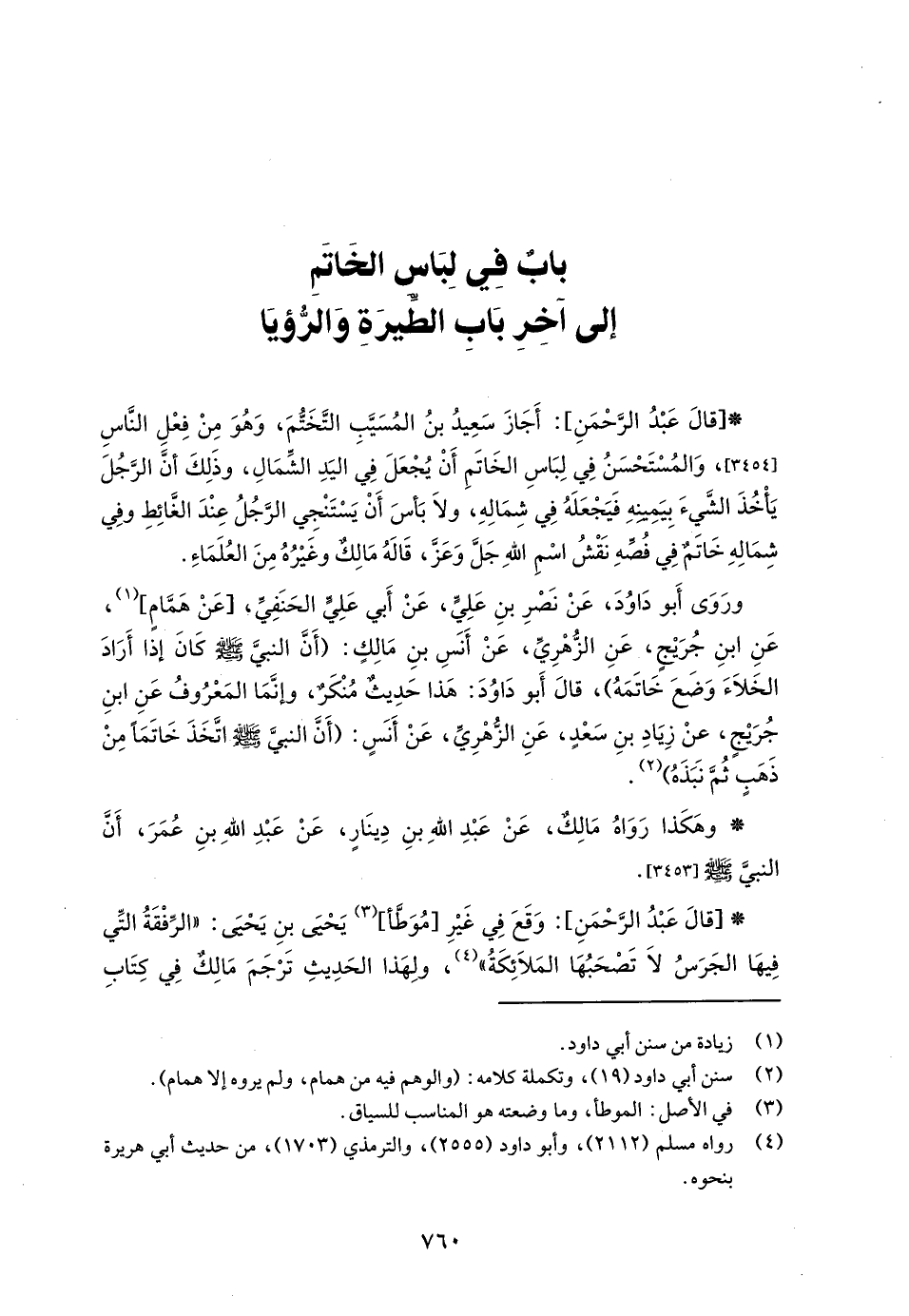 * [قالَ عَبْدُ الرَّحْمَنِ]: أَجَازَ سَعِيدُ بنُ المُسَيَّبِ التَّخَتُّمَ، وَهُوَ مِنْ فِعْلِ النَّاسِ، وَالمُسْتَحْسَنُ في لِبَاسِ الخَاتَمِ أَنْ يُجْعَلَ في اليَدِ الشِّمَالِ، وذَلِكَ أنَّ الرَّجُلَ يَأخُذَ الشَّيءَ بِيَمِينهِ فَيَجْعَلَهُ في شِمَالِهِ، ولَا بَأْسَ أَنْ يَسْتَنْجِي الرَّجُلُ عِنْدَ الغَّائِطِ وفِي شِمَالِهِ خَاتَم في فُصّهِ نَقْشُ اسْمِ اللهِ -جَلَّ وَعَزَّ-، قَالَهُ مَالِكٌ وغَيْرُهُ مِنَ العُلَمَاءِ.