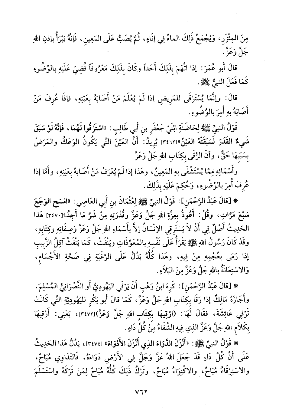 * [قالَ عَبْدُ الرَّحْمَنِ]: قَوْلُ النبيِّ - صلى الله عليه وسلم - لِعُثْمَانَ بنِ أَبي العَاصِي: "امْسَح الوَجَعَ سَبْعَ مَرَّاتِ، وقُلْ: أَعُوذُ بِعِزَّةِ اللهِ -جَلَّ وَعَزَّ- وقُدْرَتهِ مِنْ شرّ مَا أَجِدُ" هَذا الحَدِيثُ أَصْلٌ في أَنْ لَا يَسْتَرِقِي الإنْسَانُ إلَّا بأَسْمَاءِ اللهِ -جَلَّ وَعَزَّ- وَصِفَاتِهِ وكِتَابِهِ، وقَدْ كَانَ رَسُولُ اللهِ - صلى الله عليه وسلم - يقْرَأُ عَلَى نَفْسِهِ بالمُعَوِّذَاتِ ويَنْفَثُ، كَمَا يَنْفَثُ آكِلُ الزَّبِيبِ إذا رَمَى بعُجْمِهِ مِنْ فِيهِ، وهَذا كُلُّهُ يَدُلُّ عَلَى الرَّغْبَةِ في صَحَّةِ الأَجْسَامِ، وَالإسْتِعَانة باللهِ -جَلَّ وَعَزَّ- مِنَ البَلاَءِ.