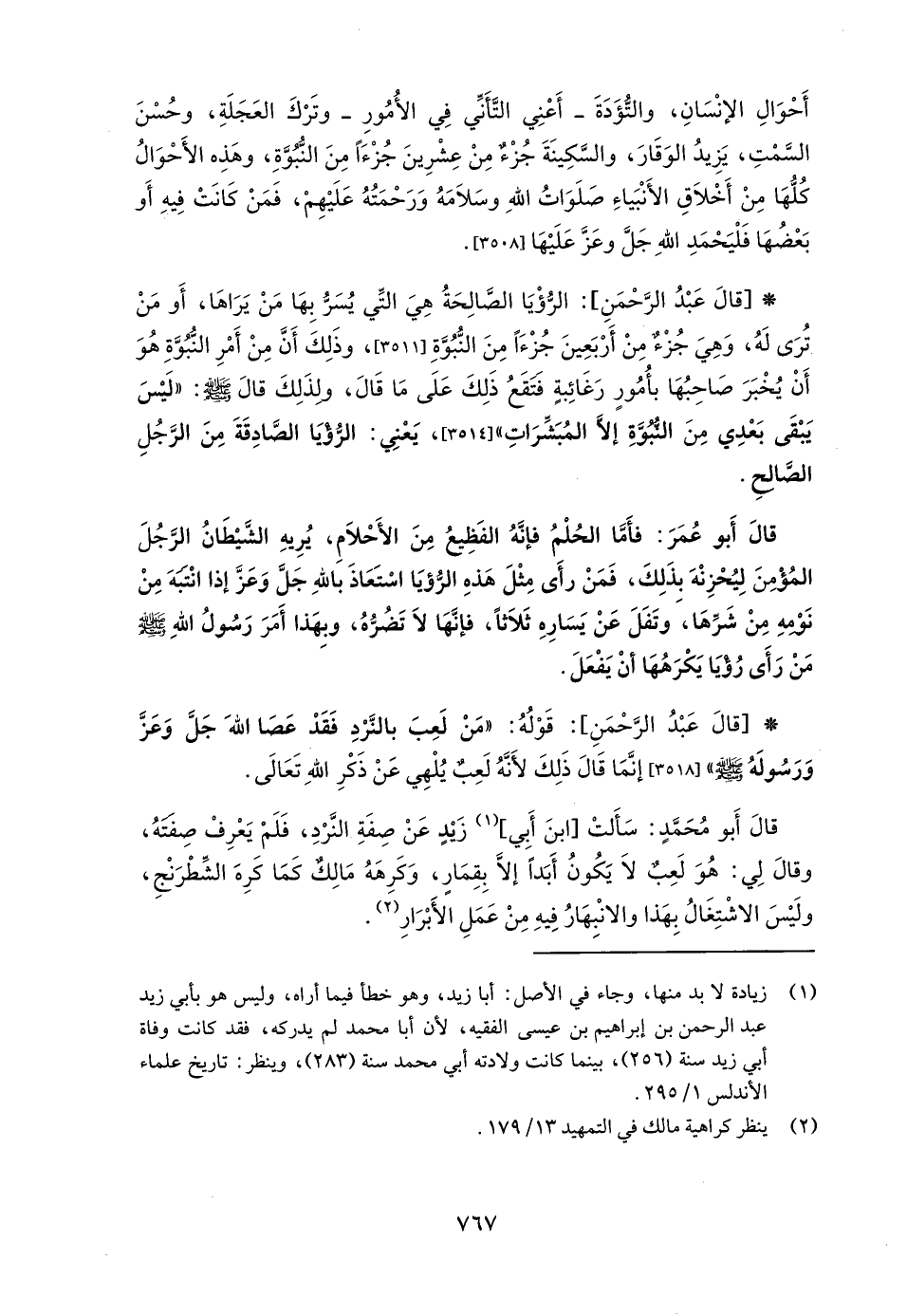 * [قالَ عَبْدُ الرَّحْمَنِ]: الرُّؤْيَا الصَّالِحَةُ هِيَ الَّتي يُسَرُّ بِهَا مَنْ يَرَاهَا، أَو مَنْ تُرَى لَهُ، وَهِيَ جُزْءٌ مِنْ أَرْبَعِينَ جُزْءَاً مِنَ النُّبُوَّةِ، وذَلِكَ أَنَّ مِنْ أَمْرِ النُبُوَّةِ هُوَ أَنْ يُخْبَرَ صَاحِبُهَا بأُمُورٍ رَغَائِبةٍ فَتَقَعُ ذَلِكَ عَلَى مَا قَالَ، ولذَلِكَ قالَ - صلى الله عليه وسلم -: "ليس يَبْقَى بَعْدِي مِنَ النُّبوَّةِ إلَّا المُبَشِّرَاتِ"، يَعْنِي: الرؤيَا الصَّادِقَةَ مِنَ الرَّجُلِ الصَّالح.
