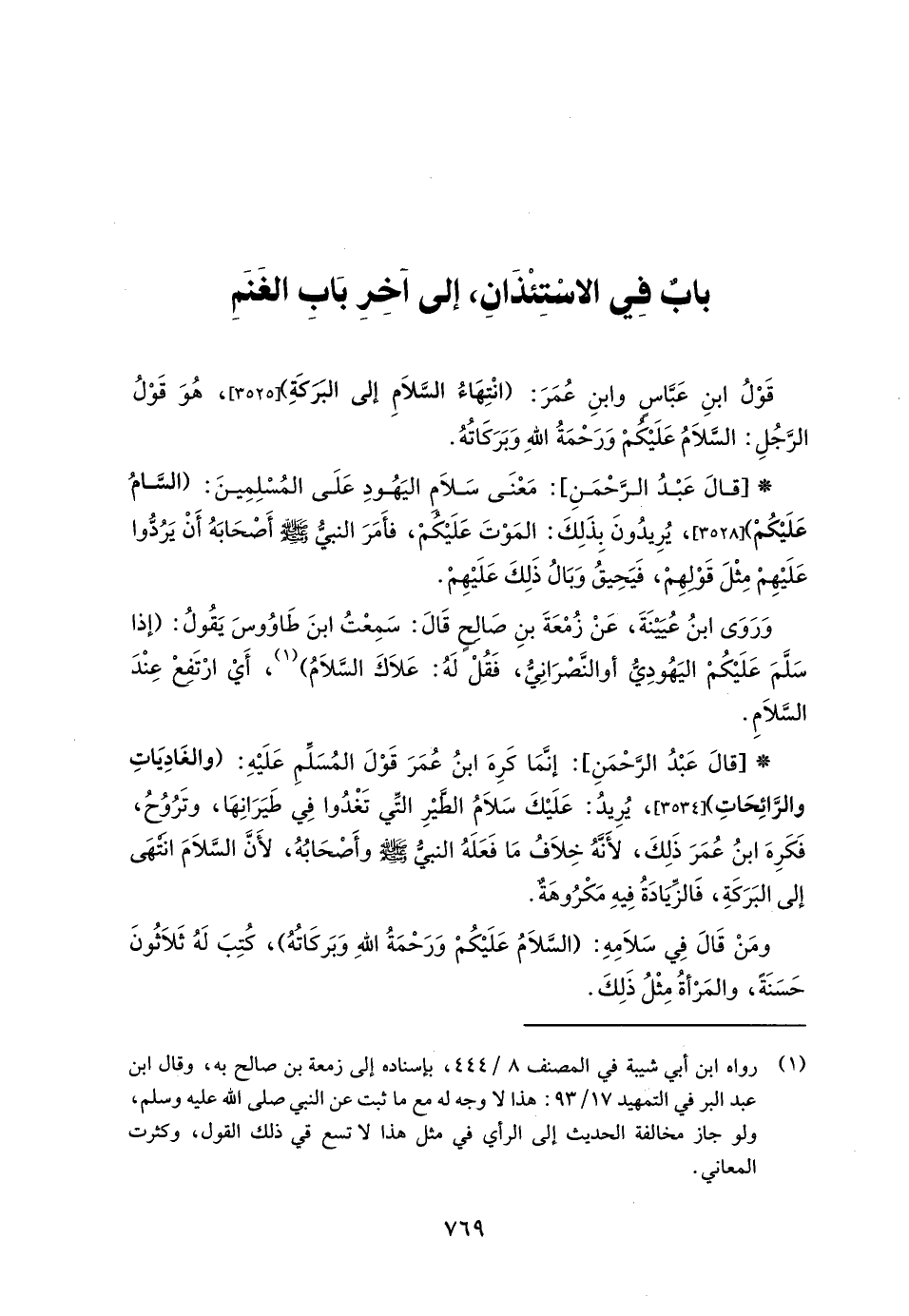 * [قالَ عَبْدُ الرَّحْمَنِ]: إنَّمَا كَرِهَ ابنُ عُمَرَ قَوْلَ المُسَلِّمِ عَلَيْهِ: (والغَادَيَاتَ والرَّائِحَاتِ)، يُرِيدُ: عَلَيْكَ سَلاَمُ الطَّيْرِ الَّتي تَغْدُوا في طَيَرَانِهَا، وتَرُوُحُ، فَكَرِهَ ابنُ عُمَرَ ذَلِكَ، لأَنَّهُ خِلاَفُ مَا فَعَلَهُ النبي - صلى الله عليه وسلم - وأَصْحَابُهُ، لأَنَّ السَّلاَمَ انتهَى إلى البَرَكَةِ، فَالزِّيَادَةُ فِيهِ مَكْرُوهَةٌ.