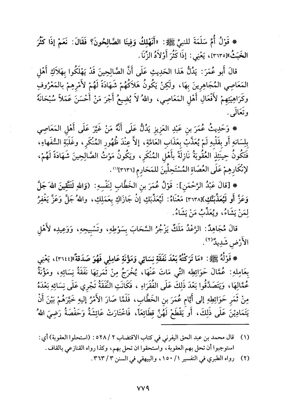 * وَحَدِيثُ عُمَرَ بنِ عَبْدِ العَزِيزِ يَدُلُّ عَلَى أَنَّهُ مَنْ غَيَّرَ عَلَى أَهْلِ المَعَاصِي بِلِسَانهِ أَو بِقَلْبهِ لَمْ يُعَذَّبْ بِعَذَابِ العَامَّةِ، إلَّا عِنْدَ ظُهُورِ المُنْكَرِ، وغَلَبَةِ السُّفَهاءِ، فَتَكُونُ حِينَئِذٍ العُقُوبَةُ نَازِلَةَّ بَأَهْلِ المُنْكَرِ، ويَكُونُ مَوْتُ الصَّالِحِينَ شَهَادَة لَهُمْ، لإنْكَارِهِمْ عَلَى العُصَاةِ المُسْتَحِلِّينَ للمَحَارِمِ (¬1).