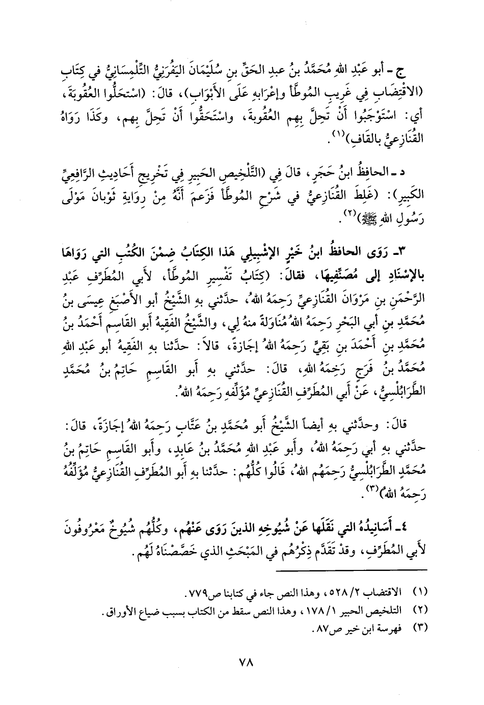 د - الحافِظُ ابنُ حَجَرٍ، قالَ فِي (التَّلْخِيصِ الحَبِيرِ فِي تَخْرِيجِ أَحَادِيثِ الرَّافِعِيِّ الكَبِيرِ): (غَلِطَ القُنَازِعيُّ في شَرْحِ المُوطَّأ فَزَعمَ أَنَّهُ مِنْ رِوَايةِ ثَوْبانَ مَوْلَى رَسُولِ اللهِ - صلى الله عليه وسلم -) (¬2).