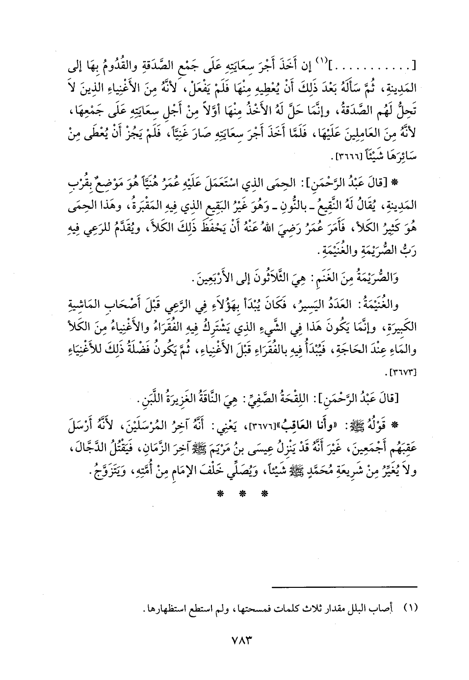 * [قالَ عَبْدُ الرَّحْمَنِ]: الحِمَى الذِي اسْتَعَمَلَ عَلَيْهِ عُمَرُ هُنَيَّاً هُوَ مَوْضِعٌ بِقُرْبِ المَدِينةِ، يُقَالُ لَهُ النَّقِيعُ -بالنُّونِ- وَهُوَ غَيْرُ البَقِيع الذِي فِيهِ المَقْبَرةُ، وهَذا الحِمَى هُوَ كَثيرُ الكَلأ، فَأَمَرَ عُمَرُ - رَضِيَ اللهُ عَنْهُ - أَنْ يَحْفَظَ ذَلِكَ الكَلأَ، ويُقَدَّمُ للرَعِي فِيهِ رَبُّ الصُّرَيْمَةِ والغُنَيْمَةِ.
