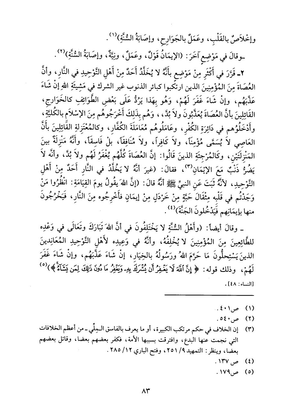 (¬3) إن الخلاف في حكم مرتكب الكبيرة، أو ما يعرف بالفاسق المِلِّي- من أعظم الخلافات التي نجمت عنها البدع، وافترقت بسببها الأمة، فكفر بعضهم بعضاً، وقاتل بعضهم بعضاً، وينظر: التمهيد 9/ 251، وفتح الباري 12/ 285.