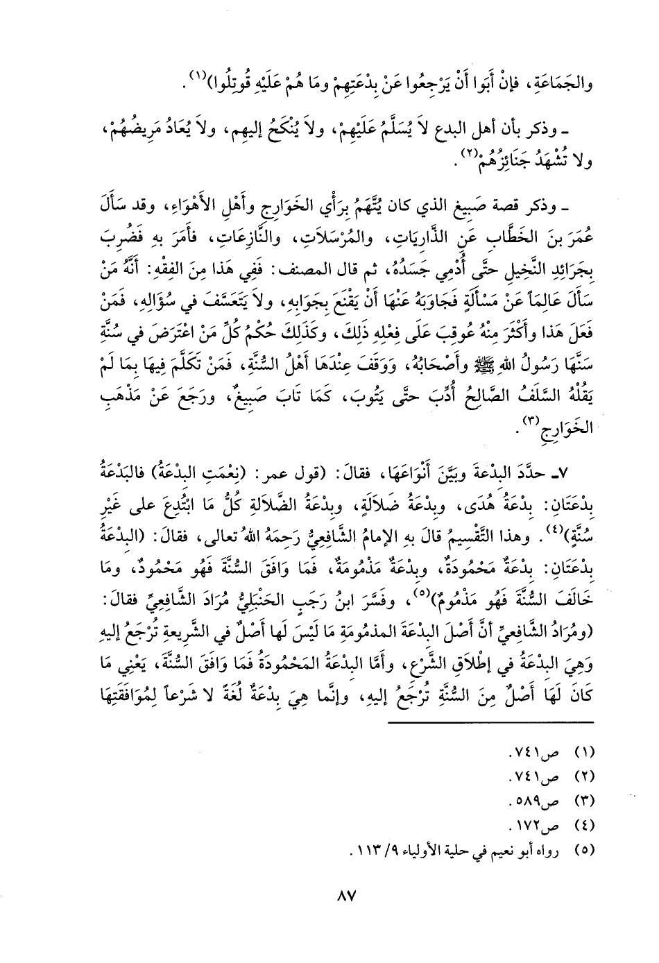 - وذكر بأن أهل البدع لاَ يُسَلَّمُ عَلَيْهِمْ، ولَا يُنْكَحُ إليهِم، ولَا يُعَادُ مَرِيضُهُمْ، ولا تُشْهَدُ جَنَائِزُهُمْ (¬2).
