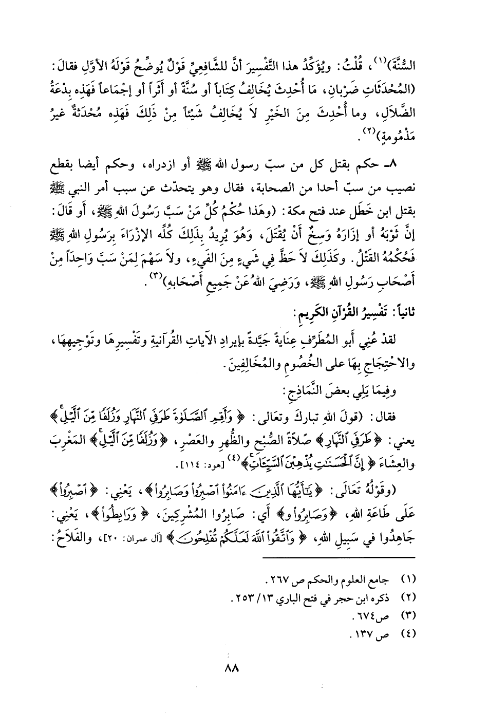 8 - حكم بقتل كل من سبّ رسول الله - صلى الله عليه وسلم -أو ازدراه، وحكم أيضاً بقطع نصيب من سبّ أحداً من الصحابة، فقال وهو يتحدَّث عن سبب أمر النبي - صلى الله عليه وسلم - بقتل ابن خَطَل عند فتح مكّة: (وهَذا حُكْمُ كُلِّ مَنْ سَبَّ رَسُولَ اللهِ - صلى الله عليه وسلم -، أَو قَالَ: إنَّ ثَوْبَهُ أو إزَارَهُ وَسِخٌ أَنْ يُقْتَلَ، وَهُوَ يُرِيدُ بِذَلِكَ كُلِّه الإزْرَاءَ بِرَسُولِ اللهِ - صلى الله عليه وسلم - فَحُكْمُهُ القَتلُ. وكَذَلِكَ لاَ حَظَّ فِي شَيءٍ مِنَ الفَيءِ، ولَا سَهْمَ لِمَنْ دسَبَّ وَاحِدَاً مِنْ أَصْحَابِ رَسُولِ اللهِ - صلى الله عليه وسلم -، وَرَضِيَ اللهُ عَنْ جَمِيعِ أَصْحَابهِ) (¬3).