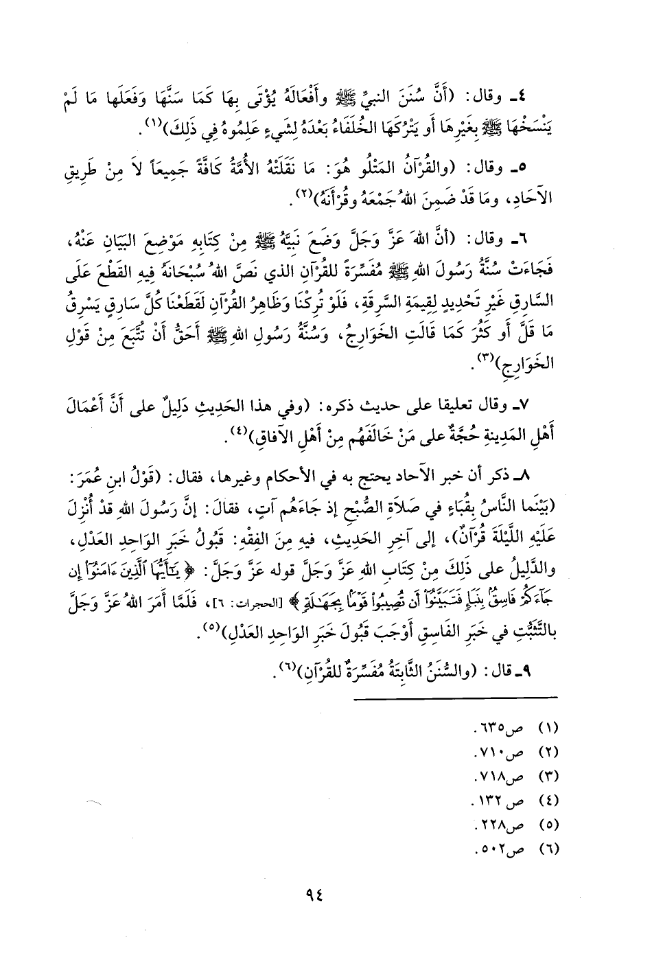 6 - وقال: (أَنَّ اللهَ -عَزَّ وَجَلَّ- وَضَعَ نَبيَّهُ فيما منْ كِتَابِهِ مَوْضِعَ البَيَانِ عَنْهُ، فَجَاءَتْ سُنَّةُ رَسُولَ اللهِ - صلى الله عليه وسلم - مفَسِّرَة للقُرْآنِ اَلذي نَصَّ اللهُ سُبْحَانَهُ فِيهِ القَطْعَ عَلَى السَّارِقِ غَيْرِ تَحْدِيدٍ لِقِيمَةِ السَّرِقَةِ، فَلَوْ تُرِكْنَا وَظَاهِرُ القُرْآنِ لَقَطَعْنَا كُلَّ سَارِقٍ يَسْرِقُ مَا قَلَّ أَو كَثُرَ كَمَا قَالَتِ الخَوَارِجُ، وَسُنَّةُ رَسُولِ الله - صلى الله عليه وسلم - أحَقُّ أَنْ تُتَّبَعَ مِنْ قَوْلِ الخَوَارِجِ) (¬3).