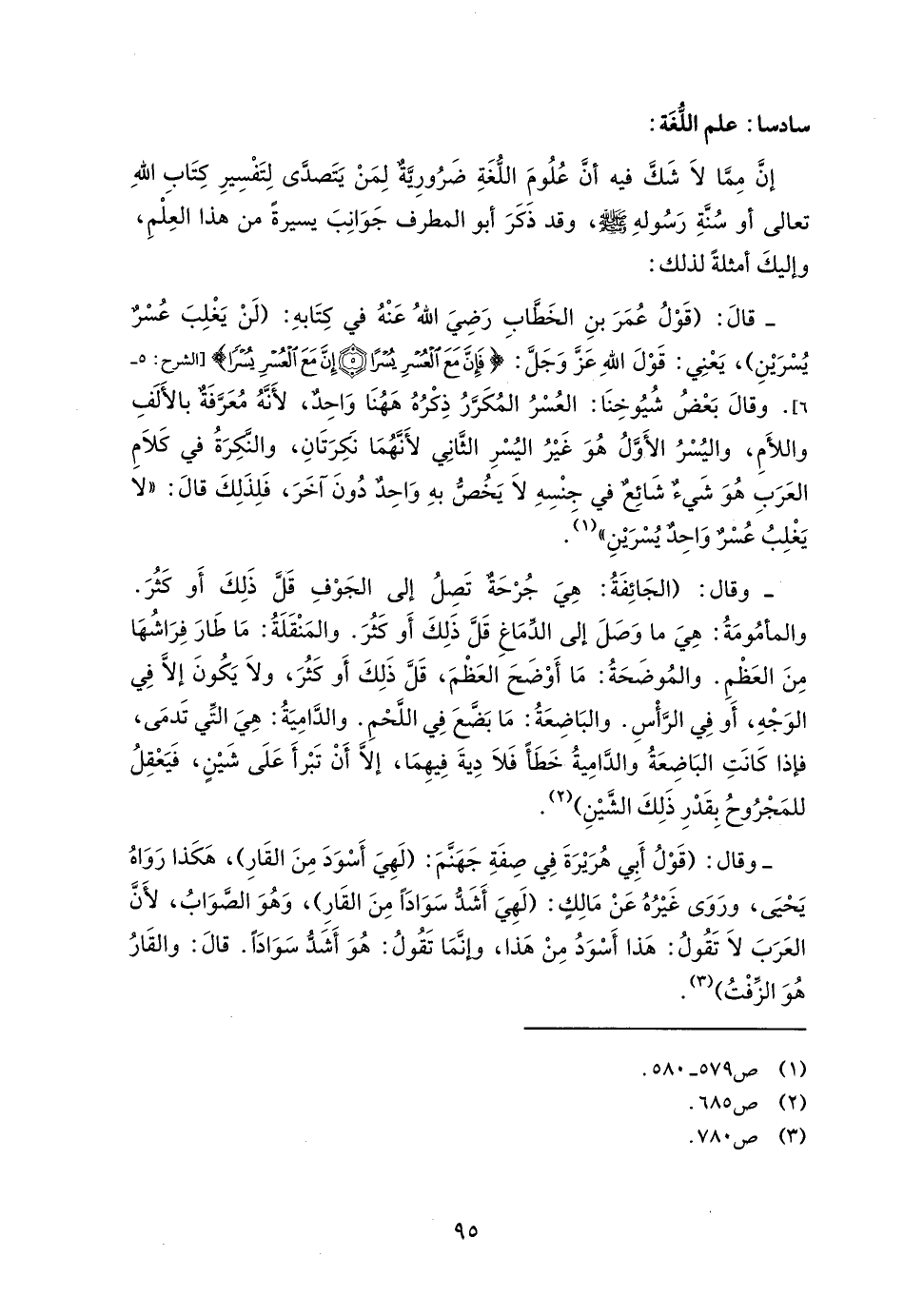 - قالَ: (قَوْلُ عُمَرَ بنِ الخَطَّاب - رَضِيَ اللهُ عَنْهُ - في كِتَابهِ: (لَنْ يَغْلِبَ عُسْرٌ يُسْرَيْنِ)، يَعْنِي: قَوْلَ اللهِ -عَزَّ وَجَلَّ-: {فَإِنَّ مَعَ الْعُسْرِ يُسْرًا (5) إِنَّ مَعَ الْعُسْرِ يُسْرًا} [الشرح: 5 - 6]. وقالَ بَعْضُ شُيُوخِنَا: العُسْرُ المُكَررُ ذِكْرُهُ هَهُنَا وَاحِدٌ، لأَنَّهُ مُعَرَّفَةٌ بالأَلَفِ واللأَمِ، واليُسْرُ الأَوَّلُ هُوَ غَيْرُ اليُسْرِ الثَّانِي لأَنَّهُمَا نَكِرَتَانِ، والنَّكِرَةُ في كَلَامِ العَرَبِ هُوَ شَيءٌ شَائِعٌ في جنْسِهِ لَا يَخُصُّ بهِ وَاحِدٌ دُونَ آخَرَ، فَلِذَلِكَ قالَ: "لا يَغْلِبُ عُسْرٌ وَاحِدٌ يُسْرَيْنِ" (¬1).
