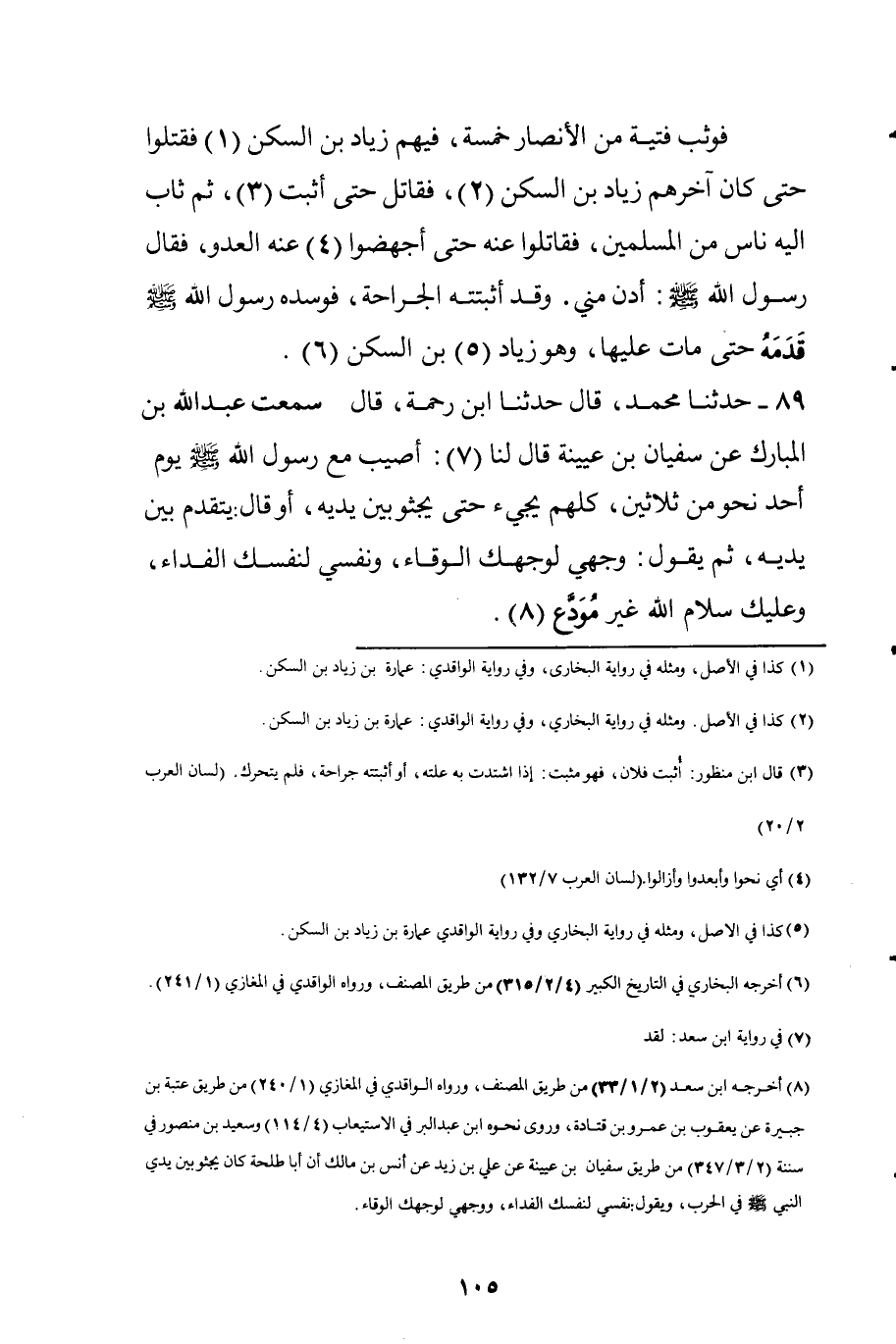 89- سَمِعْتُ عَبْدَ اللهِ بْنَ المُبَارَكِ، عَنْ سُفْيَانَ بْنِ عُيَيْنَةَ, قَالَ لَنَا: أُصِيبَ مَعَ رَسُولِ اللَّهِ صَلَّى اللهُ عَلَيْهِ وَسَلَّمَ يَوْمَ أُحُدٍ نَحْوٌ مِنْ ثَلاَثِينَ، كُلُّهُمْ يَجِيءُ حَتَّى يَجْثُوَ بَيْنَ يَدَيْهِ, أَوْ قَالَ: يَتَقَدَّمُ بَيْنَ يَدَيْهِ, ثُمَّ يَقُولُ: وَجْهِي لِوَجْهِكَ الْوِقَاءُ, وَنَفْسِي لِنَفْسِكَ الْفِدَاءُ, وَعَلَيْكَ سَلاَّمُ اللَّهِ غَيْرُ مُوَدِّعٍ.