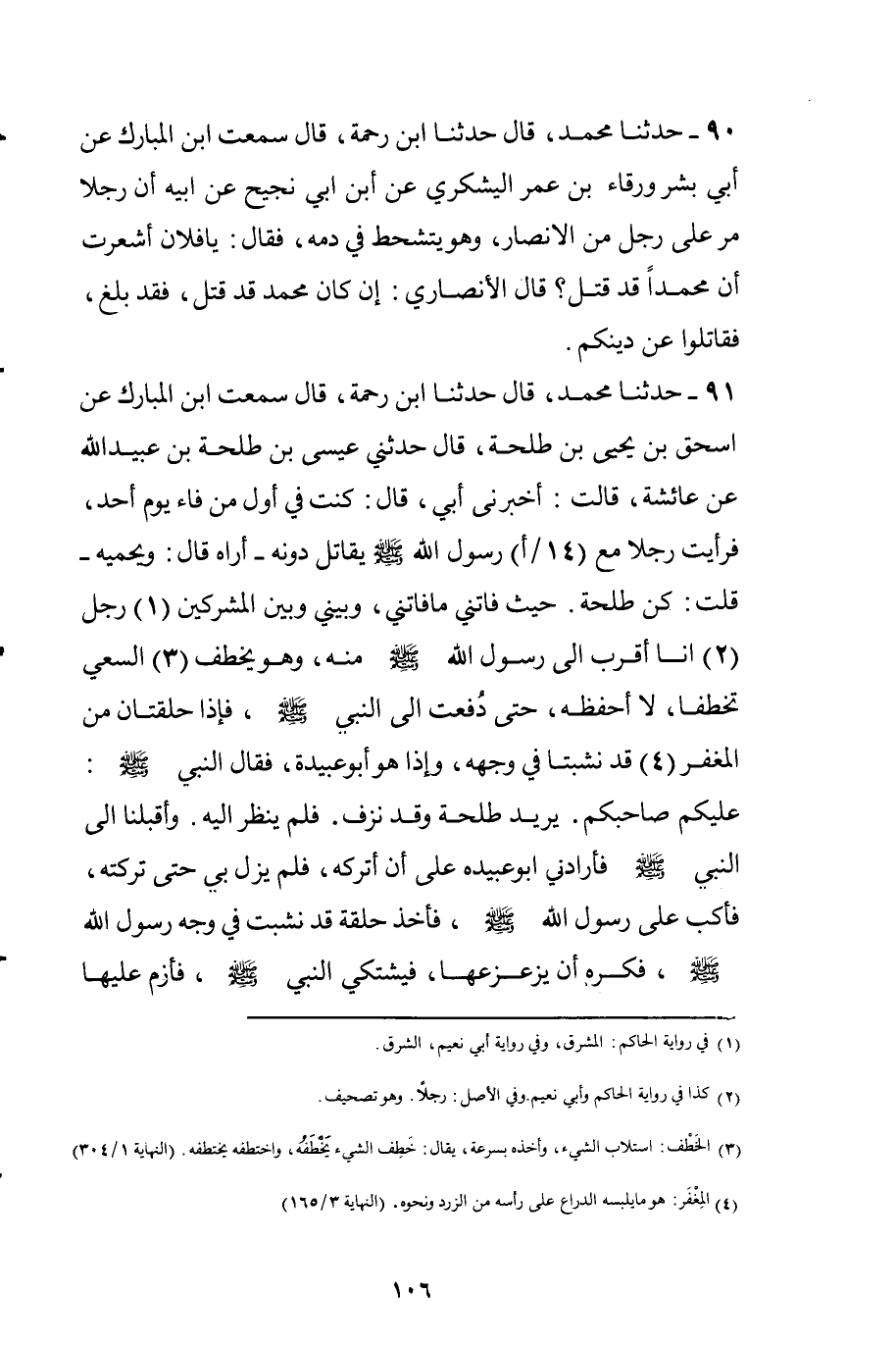 91 - سَمِعْتُ ابْنُ المُبَارَكِ، عَنْ إِسْحَاقَ بْنِ يَحْيَى بْنِ طَلْحَةَ قَالَ: حَدَّثَنِي عِيسَى بْنُ طَلْحَةَ بْنِ عُبَيْدِ اللَّهِ، عَنْ عَائِشَةَ، قَالَتْ: أَخْبَرَنِي أَبِي قَالَ: كُنْتُ فِي أَوَّلِ مَنْ فَاءَ يَوْمَ أُحُدٍ, فَرَأَيْتُ رَجُلاً مَعَ رَسُولِ اللَّهِ صَلَّى اللَّهُ عَلَيْهِ وَسَلَّمَ يُقَاتِلُ دُونَهُ, أَرَاهُ قَالَ: وَيَحْمِيهِ, قُلْتُ: كُنْ طَلْحَةَ, حَيْثُ فَاتَنِي مَا فَاتَنِي, وَبَيْنِي وَبَيْنَ الْمُشْرِكِينَ رَجُلٌ, أَنَا أَقْرَبُ إِلَى رَسُولِ اللَّهِ صَلَّى اللَّهُ عَلَيْهِ وَسَلَّمَ مِنْهُ، وَهُوَ يَخْطَفُ السَّعْيَ تَخَطُّفًا لاَ أَحْفَظُهُ, حَتَّى دُفِعْتُ إِلَى النَّبِيِّ صَلَّى اللَّهُ عَلَيْهِ وَسَلَّمَ, فَإِذَا حَلَقَتَانِ مِنَ الْمِغْفَرِ قَدْ نَشَبَتَا فِي وَجْهِهِ, وَإِذَا هُوَ أَبُو عُبَيْدَةَ, فَقَالَ النَّبِيُّ صَلَّى اللَّهُ عَلَيْهِ وَسَلَّمَ: عَلَيْكُمْ صَاحِبَكُمْ, يُرِيدُ طَلْحَةَ, وَقَدْ نَزَفَ, فَلَمْ يَنْظُرْ إِلَيْهِ, وَأَقْبَلْنَا إِلَى النَّبِيِّ صَلَّى اللَّهُ عَلَيْهِ وَسَلَّمَ, فَأَرَادَنِي أَبُو عُبَيْدَةَ عَلَى أَنْ أَتْرُكَهُ, فَلَمْ يَزَلْ بِي حَتَّى تَرَكْتُهُ, فَأَكَبَّ عَلَى رَسُولِ اللَّهِ صَلَّى اللَّهُ عَلَيْهِ وَسَلَّمَ, فَأَخَذَ حَلْقَةً قَدْ نَشِبَتْ فِي وَجْهِ رَسُولِ اللَّهِ صَلَّى اللَّهُ عَلَيْهِ وَسَلَّمَ، فَكَرِهَ أَنْ يُزَعْزِعَهَا, فَيَشْتَكِي النَّبِيُّ صَلَّى اللَّهُ عَلَيْهِ وَسَلَّمَ, فَأَزَمَ عَلَيْهَا بِثَنِيَّتِهِ, ثُمَّ نَهَضَ عَلَيْهَا, فَنَدَرَتْ ثَنِيَّتُهُ, وَنَزَعَهَا, فَقُلْتُ: دَعْنِي, فَأَتَى, فَطَلَبَ إِلَيَّ, فَأَكَبَّ عَلَى الأُخْرَى, فَصَنَعَ بِهَا مِثْلَ ذَلِكَ, فَنَزَعَهَا, وَنَدَرَتْ ثَنِيَّتُهُ, فَكَانَ أَبُو عُبَيْدَةَ أَهْتَمَ الثَّنَايَا.