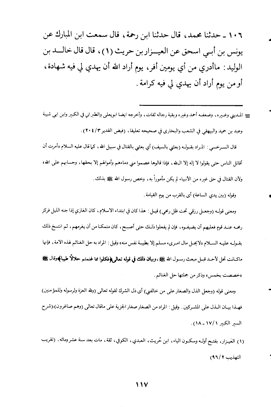 106- سَمِعْتُ ابْنُ المُبَارَكِ، عَنْ يُونُسَ بْنِ أَبِي إِسْحَاقَ، عَنِ الْعَيْزَارِ بْنِ حُرَيْثٍ قَالَ: قَالَ خَالِدُ بْنُ الْوَلِيدِ: مَا أَدْرِي مِنْ أَيِّ يَوْمَيْنِ أَفِرُّ، يَوْمٌ أَرَادَ اللَّهُ أَنْ يَهْدِيَ لِي فِيهِ شَهَادَةً، أَوْ مِنْ يَوْمٍ أَرَادَ أَنْ يَهْدِيَ لِي فِيهِ كَرَامَةً.