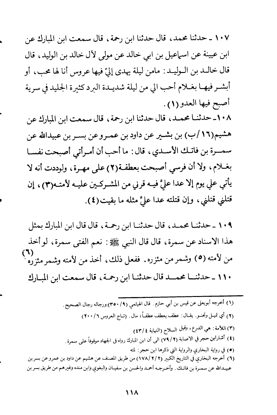 108 - سَمِعْتُ ابْنُ المُبَارَكِ، عَنْ هُشَيْمِ بْنِ بَشِيرٍ، عَنْ دَاوُدَ بْنِ عَمْرٍو، عَنْ بُسْرِ بْنِ عُبَيْدِ اللَّهِ، عَنْ سَمُرَةَ بْنِ فَاتِكٍ الأَسَدِيِّ قَالَ: مَا أُحِبُّ أَنَّ امْرَأَتِي أَصْبَحَتْ نَفَسًا بِغُلاَمٍ، وَلاَ أَنَّ فَرَسِي أَصْبَحَتْ بِعَطْفَةٍ عَلَى مُهْرَةٍ، وَلَوَدِدْتُ أَنَّهُ لاَ يَأْتِي عَلَيَّ يَوْمٌ إِلاَّ عَدَا عَلَيَّ فِيهِ قَرْنِي مِنَ الْمُشْرِكِينَ، عَلَيْهِ لأَمَتُهُ، إِنْ قَتَلَنِي قَتَلَنِي، وَإِنْ قَتَلْتُهُ عَدَا عَلَيَّ مِثْلُهُ مَا بَقِيَتُ.