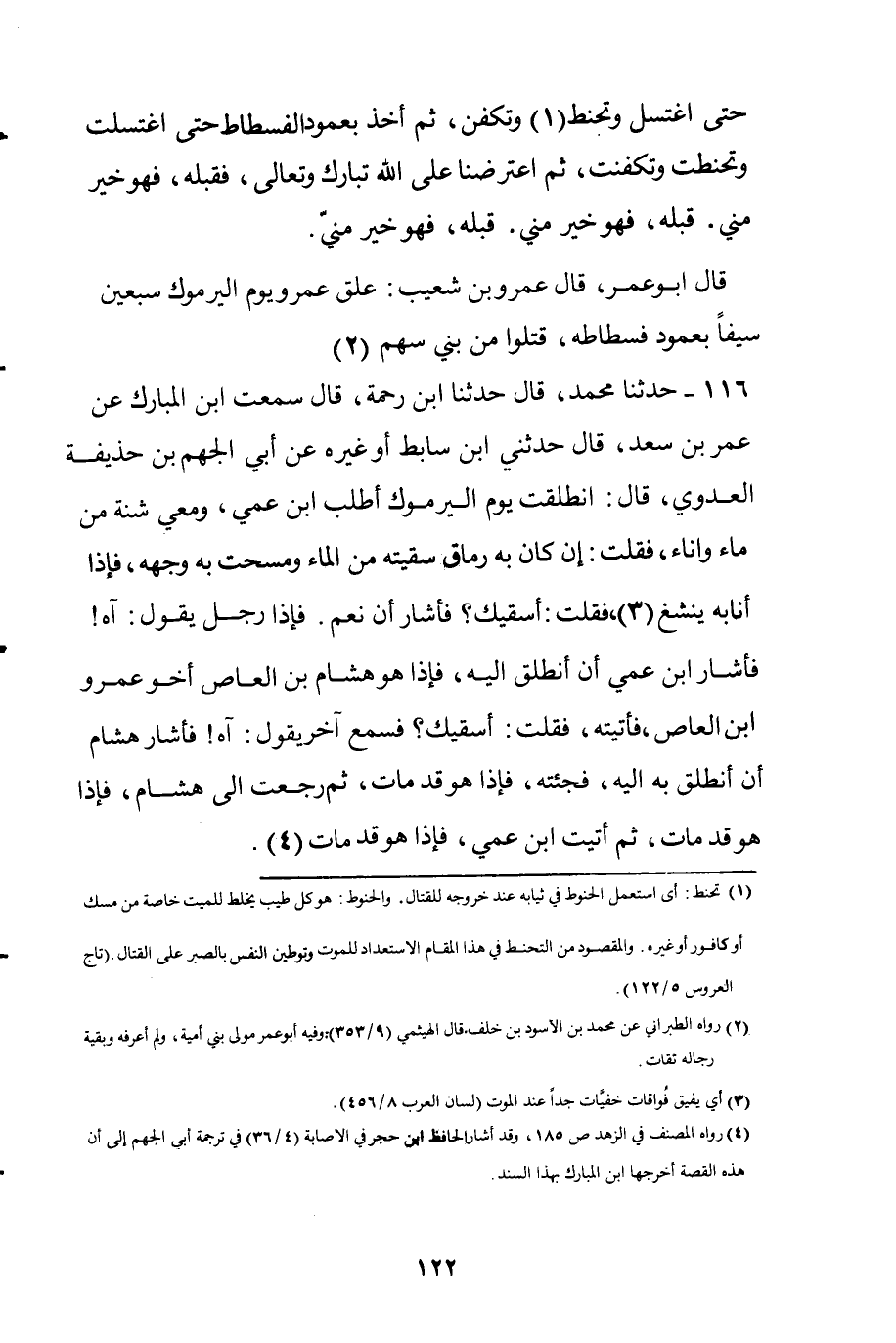 116- سَمِعْتُ ابْنُ المُبَارَكِ، عَنْ عُمَرَ بْنِ سَعِيدٍ, قَالَ: حَدَّثَنِي ابْنُ سَابِطٍ، أَوْ غَيْرُهُ، عَنْ أَبِي الْجَهْمِ بْنِ حُذَيْفَةَ الْعَدَوِيِّ قَالَ: انْطَلَقْتُ يَوْمَ الْيَرْمُوكِ أَطْلُبُ ابْنَ عَمِّي, وَمَعِي شَنَّةٌ مِنْ مَاءٍ وَإِنَاءٍ، فَقُلْتُ: إِنْ كَانَ بِهِ رِمَاقٌ سَقَيْتُهُ مِنَ الْمَاءِ، وَمَسَحْتُ بِهِ وَجْهَهُ، فَإِذَا أَنَا بِهِ يَنْشَغُ، فَقُلْتُ: أَسْقِيكَ؟ فَأَشَارَ أَنْ نَعَمْ, فَإِذَا رَجُلٌ يَقُولُ: آهٍ, فَأَشَارَ ابْنُ عَمِّي أَنِ انْطَلِقْ إِلَيْهِ، فَإِذَا هُوَ هِشَامُ بْنُ الْعَاصِ, أَخُو عَمْرِو بْنِ الْعَاصِ، فَأَتَيْتُهُ، فَقُلْتُ: أَسْقِيكَ؟ فَسَمِعَ آخَرَ يَقُولُ: آهٍ, فَأَشَارَ هِشَامٌ أَنِ انْطَلِقْ بِهِ إِلَيْهِ، فَجِئْتُهُ، فَإِذَا هُوَ قَدْ مَاتَ، ثُمَّ رَجَعْتُ إِلَى هِشَامٍ، فَإِذَا هُوَ قَدْ مَاتَ، ثُمَّ أَتَيْتُ ابْنَ عَمِّي, فَإِذَا هُوَ قَدْ مَاتَ.