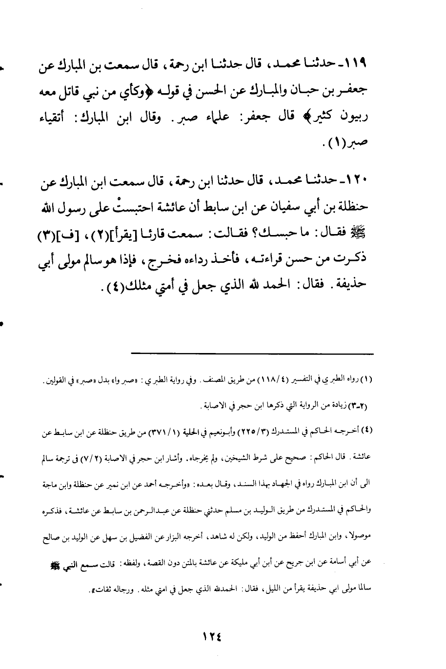 120- سَمِعْتُ ابْنُ المُبَارَكِ، عَنْ حَنْظَلَةَ بْنِ أَبِي سُفْيَانَ، عَنِ ابْنِ سَابِطٍ, أَنِّ عَائِشَةَ احْتَبَسَتْ عَلَى رَسُولِ اللَّهِ صَلَّى اللهُ عَلَيْهِ وَسَلَّمَ، فَقَالَ: مَا حَبَسَكِ؟ فَقَالَتْ: سَمِعْتُ قَارِئًا يَقْرَأُ, فَذَكَرَتْ مِنْ حُسْنِ قِرَاءَتِهِ، فَأَخَذَ رِدَاءَهُ، فَخَرَجَ، فَإِذَا هُوَ سَالِمٌ, مَوْلَى أَبِي حُذَيْفَةَ، فَقَالَ: الْحَمْدُ لِلَّهِ الَّذِي جَعَلَ فِي أُمَّتِي مِثْلَكَ.