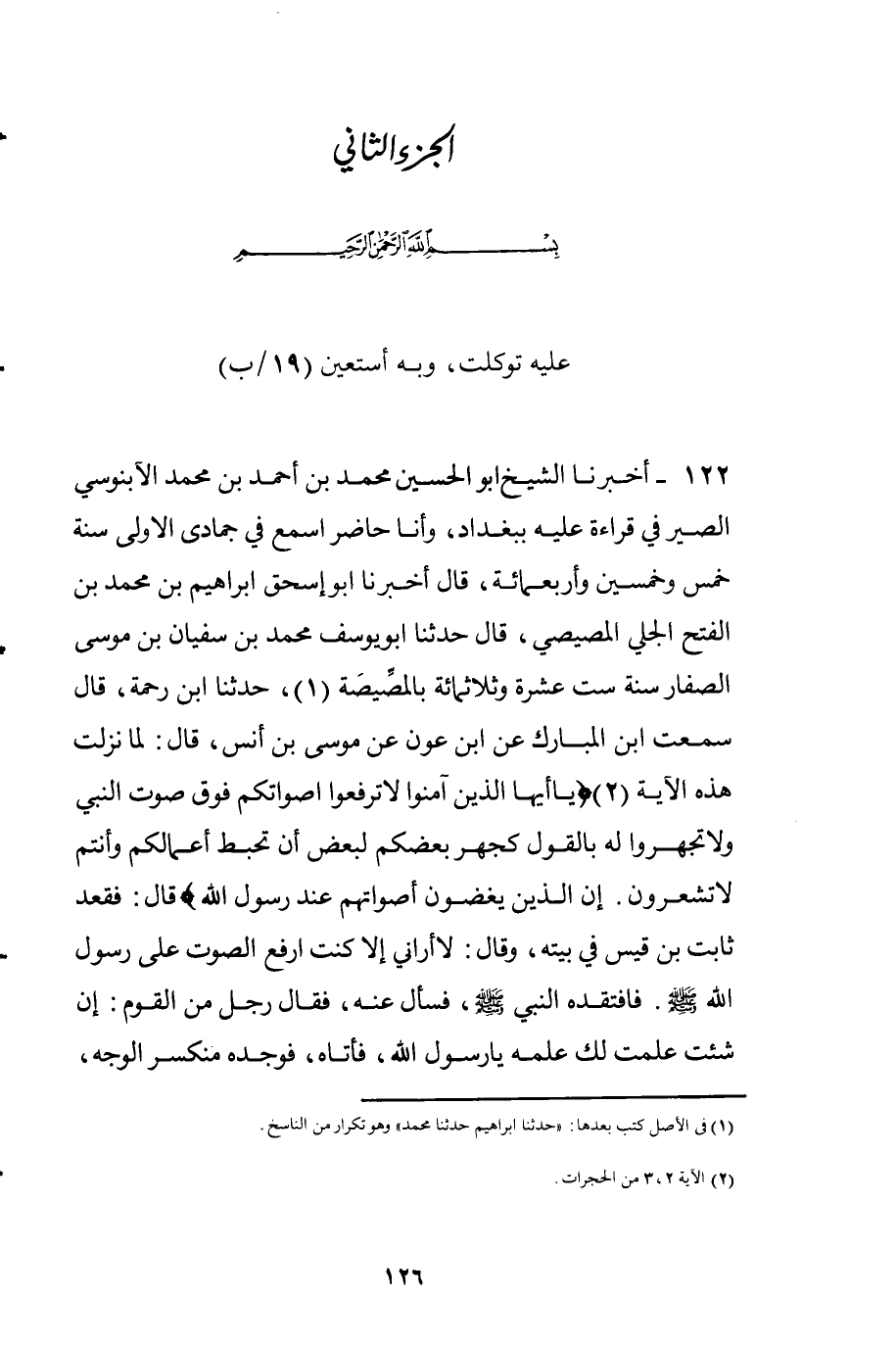 122 - أَخْبَرَنَا الشَّيْخُ أَبُو الْحُسَيْنِ مُحَمَّدُ بْنُ أَحْمَدَ بْنِ مُحَمَّدٍ الآبَنُوسِيُّ الصَّيْرَفِيُّ قِرَاءَةً عَلَيْهِ بِبَغْدَادَ، وَأَنَا حَاضِرٌ أَسْمَعُ فِي جُمَادَى الأُولَى, سَنَةَ خَمْسٍ وَخَمْسِينَ وَأَرْبَعِمِئَةٍ، قَالَ: أَخْبَرَنَا أَبُو إِسْحَاقَ إِبْرَاهِيمُ بْنُ مُحَمَّدِ بْنِ الْفَتْحِ الْجَلِيُّ الْمَصِّيصِيُّ، قَالَ: حَدَّثَنَا أَبُو يُوسُفَ مُحَمَّدُ بْنُ سُفْيَانَ بْنِ مُوسَى الصَّفَّارُ, سَنَةَ سِتَّ عَشْرَةَ وَثَلاَثِمِئَةٍ بِالْمِصِّيصَةِ، حَدَّثَنَا ابْنُ رَحْمَةَ, قَالَ: سَمِعْتُ ابْنَ الْمُبَارَكِ، عَنِ ابْنِ عَوْنٍ، عَنْ مُوسَى بْنِ أَنَسٍ قَالَ: لَمَّا نَزَلَتْ هَذِهِ الآيَةُ: {يَا أَيُّهَا الَّذِينَ آمَنُوا لاَ تَرْفَعُوا أَصْوَاتَكُمْ فَوْقَ صَوْتِ النَّبِيِّ وَلاَ تَجْهَرُوا لَهُ بِالْقَوْلِ كَجَهْرِ بَعْضِكُمْ لِبَعْضٍ أَنْ تَحْبَطَ أَعْمَالُكُمْ وَأَنْتُمْ لاَ تَشْعُرُونَ إِنَّ الَّذِينَ يَغُضُّونَ أَصْوَاتَهُمْ عِنْدَ رَسُولِ اللَّهِ} قَالَ: فَقَعَدَ ثَابِتُ بْنُ قَيْسٍ فِي بَيْتِهِ، وَقَالَ: لاَ أَرَانِي إِلاَّ كُنْتُ أَرْفَعُ الصَّوْتَ عَلَى رَسُولِ اللَّهِ صَلَّى اللَّهُ عَلَيْهِ وَسَلَّمَ, فَافْتَقَدَهُ النَّبِيُّ صَلَّى اللَّهُ عَلَيْهِ وَسَلَّمَ، فَسَأَلَ عَنْهُ، فَقَالَ رَجُلٌ مِنَ الْقَوْمِ: إِنْ شِئْتَ عَلِمْتُ لَكَ عِلْمَهُ يَا رَسُولَ اللَّهِ، فَأَتَاهُ، فَوَجَدَهُ مُنْكَسِرَ الْوَجْهِ، فَقَالَ: إِنَّ رَسُولَ اللَّهِ صَلَّى اللَّهُ عَلَيْهِ وَسَلَّمَ افْتَقَدَكَ، وَسَأَلَ عَنْكَ، فَقَالَ: إِنِّي كُنْتُ أَرْفَعُ الصَّوْتَ عَلَى رَسُولِ اللَّهِ صَلَّى اللَّهُ عَلَيْهِ وَسَلَّمَ, حَتَّى نَزَلَتْ هَذِهِ الآيَةُ، وَأَنَّهُ مِنْ أَهْلِ النَّارِ، فَأَتَى رَسُولَ اللَّهِ صَلَّى اللَّهُ عَلَيْهِ وَسَلَّمَ، فَذَكَرَ لَهُ مَا قَالَ, قَالَ مُوسَى بْنُ أَنَسٍ: فَأَتَاهُ الْمَرَّةَ الثَّانِيَةَ بِبِشَارَةٍ عَظِيمةٍ، فَقَالَ لَهُ: إِنَّكَ لَسْتَ مِنْ أَهْلِ النَّارِ، وَلَكِنَّكَ مِنْ أَهْلِ الْجَنَّةِ.
