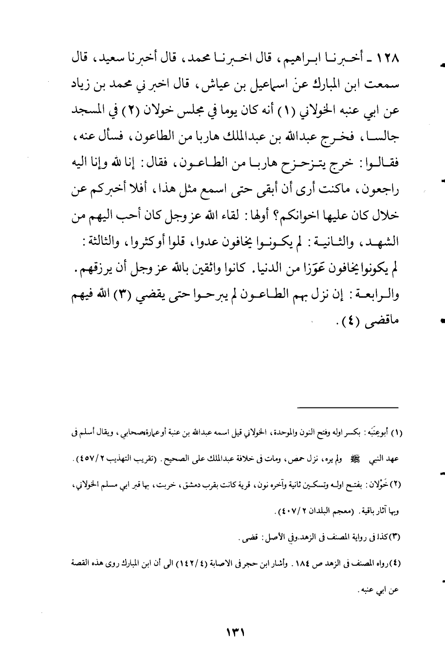 128- أَخْبَرَنَا إِبْرَاهِيْمُ، قَالَ: أَخْبَرَنَا مُحَمَّدٌ، قَالَ: أَخْبَرَنَا سَعِيْدٌ، قَالَ: سَمِعْتُ ابْنُ المُبَارَكِ، عَنْ إِسْمَاعِيلَ بْنِ عَيَّاشٍ قَالَ: أَخْبَرَنِي مُحَمَّدُ بْنُ زِيَادٍ، عَنْ أَبِي عِنَبَةَ الْخَوْلاَنِيِّ، أَنَّهُ كَانَ يَوْمًا فِي مَجْلِسِ خَوْلاَنَ فِي الْمَسْجِدِ جَالِسًا، فَخَرَجَ عَبْدُ اللَّهِ بْنُ عَبْدِ الْمَلِكِ هَارِبًا مِنَ الطَّاعُونِ، فَسَأَلَ عَنْهُ، فَقَالُوا: خَرَجَ يَتَزَحْزَحُ, هَارِبًا مِنَ الطَّاعُونِ، فَقَالَ: إِنَّا لِلَّهِ وَإِنَّا إِلَيْهِ رَاجِعُونَ, مَا كُنْتُ أَرَى أَنْ أَبْقَى حَتَّى أَسْمَعَ مِثْلَ هَذَا, أَفَلاَ أُخْبِرُكُمْ عَنْ خِلاَلٍ كَانَ عَلَيْهَا إِخْوَانُكُمْ؟ أَوَّلُهَا: لِقَاءُ اللَّهِ عَزَّ وَجَلَّ, كَانَ أَحَبَّ إِلَيْهِمْ مِنَ الشَّهْدِ، وَالثَّانِيَةُ: لَمْ يَكُونُوا يَخَافُونَ عَدُوًّا، قَلُّوا أَوْ كَثُرُوا، وَالثَّالِثَةُ: لَمْ يَكُونُوا يَخَافُونَ عَوْزًا مِنَ الدُّنْيَا، كَانُوا وَاثِقِينَ بِاللَّهِ عَزَّ وَجَل أَنْ يَرْزُقَهُمْ، وَالرَّابِعَةُ: إِنْ نَزَلَ بِهِمُ الطَّاعُونُ لَمْ يَبْرَحُوا حَتَّى يَقْضِيَ اللَّهُ فِيهِمْ مَا قَضَى.