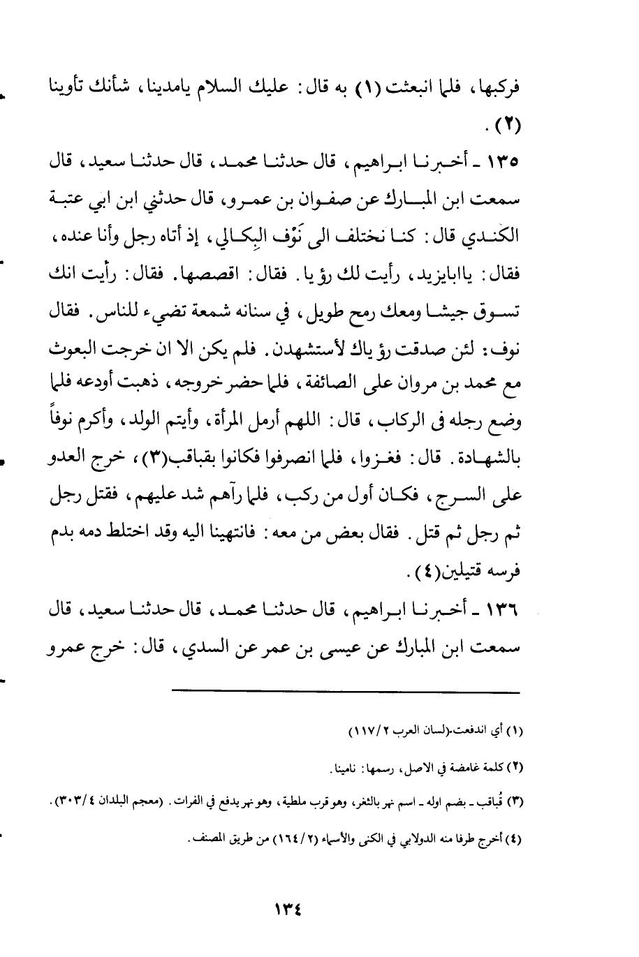 135- أَخْبَرَنَا إِبْرَاهِيْمُ، قَالَ: حَدَّثَنَا مُحَمَّدٌ، قَالَ: حَدَّثَنَا سَعِيْدٌ، قَالَ: سَمِعْتُ ابْنُ المُبَارَكِ، عَنْ صَفْوَانَ بْنِ عَمْرٍو قَالَ: حَدَّثَنِي ابْنُ أَبِي عُتْبَةَ الْكِنْدِيُّ, قَالَ: كُنَّا نَخْتَلِفُ إِلَى نَوْفٍ الْبِكَالِيِّ، إِذْ أَتَاهُ رَجُلٌ وَأَنَا عِنْدَهُ، فَقَالَ: يَا أَبَا يَزِيدَ، رَأَيْتُ لَكَ رُؤْيَا, فَقَالَ: اقْصُصْهَا, فَقَالَ: رَأَيْتُ أَنَّكَ تَسُوقُ جَيْشًا، وَمَعَكَ رُمْحٌ طَوِيلٌ فِي سَنَانِهِ شَمْعَةٌ تُضِيءُ لِلنَّاسِ, فَقَالَ نَوْفٌ: لَئِنْ صَدَقَتْ رُؤْيَاكَ لأَسْتَشْهَدَنَّ, فَلَمْ يَكُنْ إِلاَّ أَنْ خَرَجَتِ الْبُعُوثُ مَعَ مُحَمَّدِ بْنِ مَرْوَانَ عَلَى الصَّائِفَةِ، فَلَمَّا حَضَرَ خُرُوجُهُ، ذَهَبْتُ أُوَدِّعُهُ، فَلَمَّا وَضَعَ رِجْلَهُ فِي الرِّكَابِ, قَالَ: اللَّهُمَّ أَرْمِلِ الْمَرْأَةَ، وَأَيْتِمِ الْوَلَدَ، وَأَكْرِمْ نَوْفًا بِالشَّهَادَةَ, قَالَ: فَغَزُوا، فَلَمَّا انْصَرَفُوا فَكَانُوا بِقَبَاقِبَ، خَرَجَ الْعَدُوَّ عَلَى السُّرُجِ، فَكَانَ أَوَّلَ مِنْ رَكِبَ، فَلَمَّا رَآهُمْ، شَدَّ عَلَيْهِمْ، فَقَتَلَ رَجُل، ثُمَّ رَجُل، ثُمَّ قُتِلَ, فَقَالَ بَعْضُ مَنْ مَعَهُ: فَانْتَهَيْنَا إِلَيْهِ وَقَدِ اخْتَلَطَ دَمُهُ بِدَمِ فَرَسِهِ قَتِيلَيْنِ.