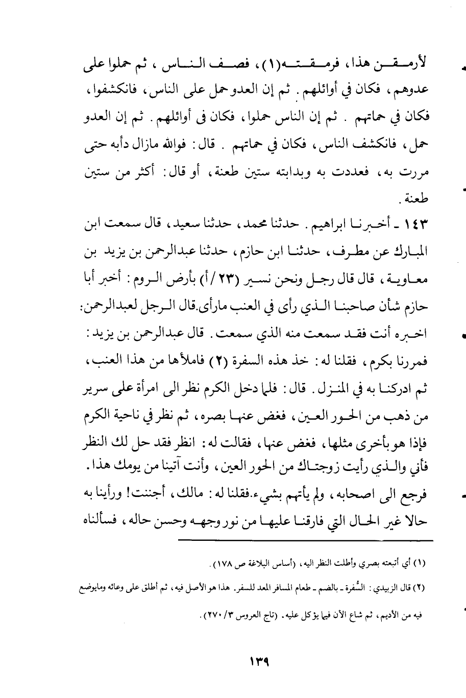 143- عَنْ مُطَرِّفٍ، حَدَّثَنَا ابْنُ حَازِمٍ، حَدَّثَنَا عَبْدُ الرَّحْمَنِ بْنُ يَزِيدَ بْنِ مُعَاوِيَةَ, قَالَ: قَالَ رَجُلٌ وَنَحْنُ نَسِيرُ بِأَرْضِ الرُّومِ: أَخْبِرْ أَبَا حَازِمٍ شَأْنَ صَاحِبِنَا الَّذِي رَأَى فِي الْعِنَبِ مَا رَأَى, قَالَ الرَّجُلُ لِعَبْدِ الرَّحْمَنِ: أَخْبِرْهُ أَنْتَ، فَقَدْ سَمِعْتُ مِنْهُ الَّذِي سَمِعْتَ, قَالَ عَبْدُ الرَّحْمَنِ بْنُ يَزِيدَ: فَمَرَرْنَا بِكَرْمٍ، فَقُلْنَا لَهُ: خُذْ هَذِهِ السُّفْرَةَ, فَامْلَأْهَا مِنْ هَذَا الْعِنَبِ، ثُمَّ أَدْرِكْنَا بِهِ فِي الْمَنْزِلِ, قَالَ: فَلَمَّا دَخَلَ الْكَرْمَ، نَظَرَ إِلَى امْرَأَةٍ عَلَى سَرِيرٍ مِنْ ذَهَبٍ مِنَ الْحُورِ الْعَيْنِ، فَغَضَّ عَنْهَا بَصَرَهُ، ثُمَّ نَظَرَ فِي نَاحِيَةِ الْكَرْمِ، فَإِذَا هُوَ بِأُخْرَى مِثْلِهَا، فَغَضَّ عَنْهَا، فَقَالَتْ لَهُ: انْظُرْ، فَقَدْ حَلَّ لَكَ النَّظَرُ، فَإِنِّي وَالَّذِي رَأَيْتَ زَوْجَتَاكَ مِنَ الْحُورِ الْعَيْنِ، وَأَنْتَ آتِينَا مِنْ يَوْمِكَ هَذَا، فَرَجَعَ إِلَى أَصْحَابِهِ، وَلَمْ يَأْتِهِمْ بِشَيْءٍ, فَقُلْنَا لَهُ: مَا لَكَ, أَجُنِنْتِ؟ وَرَأَيْنَا بِهِ حَالاً غَيْرَ الْحَالِ الَّتِي فَارَقَنَا عَلَيْهَا مِنْ نُورِ وَجْهِهِ, وَحُسْنِ حَالِهِ، فَسَأَلْنَاهُ مَا مَنَعَكَ مِنْ ذَلِكَ؟ فَاعْتَجَمَ عَلَيْنَا، حَتَّى أَقْسَمْنَا عَلَيْهِ، فَقَالَ: إِنِّي لَمَّا دَخَلْتُ الْكَرْمَ, فَقَصَّ الْقِصَّةَ، فَمَا أَدْرِي أَكَانَ ذَلِكَ أَسْرَعَ أَنِ اسْتَنْفَرَ النَّاسَ لِلْغَزْوِ، فَأَمَرْنَا بِهِ إِنْسَانًا يُمْسِكُ دَابَّتَهُ عَلَيْنَا حَتَّى أَسْرَجْنَا جَمِيعًا، ثُمَّ رَكِبَ وَرَكِبْنَا رَجَاءَ أَنْ يُصِيبَ الشَّهَادَةَ، فَتَقَدَّمَ بَيْنَ أَيْدِينَا، فَكَانَ أَوَّلَ النَّاسِ اسْتُشْهِدَ يَوْمَئِذٍ.