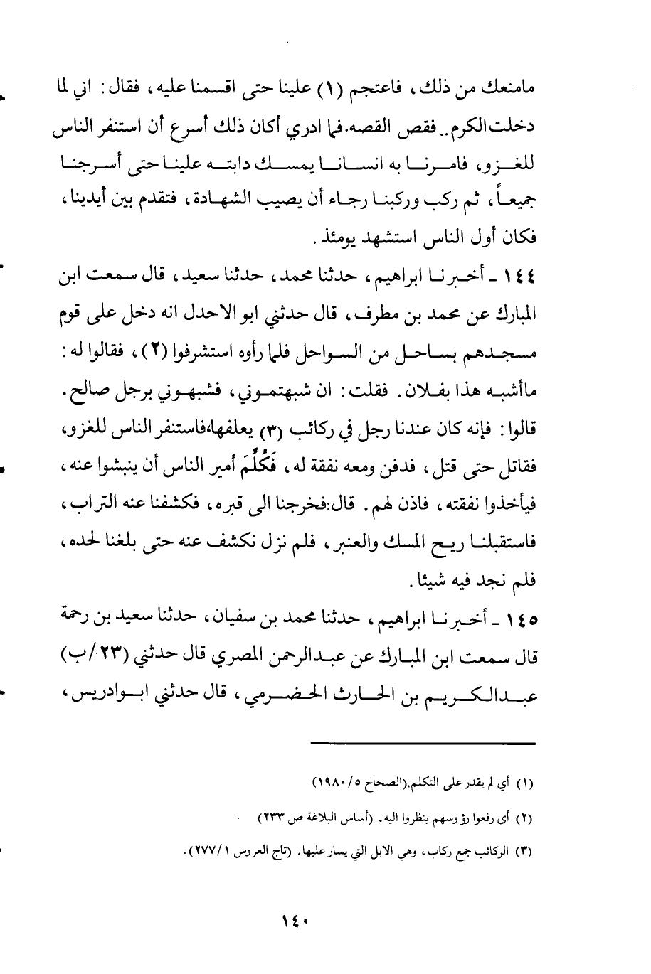 144- عَنْ مُحَمَّدِ بْنِ مُطَرِّفٍ, قَالَ: حَدَّثَنِي أَبُو الأَحْدَلِ, أَنَّهُ دَخَلَ عَلَى قَوْمٍ مَسْجِدَهُمْ, بِسَاحِلٍ مِنَ السَّوَاحِلِ، فَلَمَّا رَأَوْهُ اسْتَشْرَفُوا، فَقَالُوا لَهُ: مَا أَشْبَهَ هَذَا بِفُلاَنٍ, فَقُلْتُ: إِنْ شَبَّهْتُمُونِي, فَشَبِّهُونِي بِرَجُلٍ صَالِحٍ, قَالُوا: فَإِنَّهُ كَانَ عِنْدَنَا رَجُلٌ فِي رَكَائِبَ يَعْلِفُهَا، فَاسْتُنْفِرَ النَّاسُ لِلْغَزْوِ، فَقَاتَلَ حَتَّى قُتِلَ، فَدُفِنَ وَمَعَهُ نَفَقَةٌ لَهُ، فَكُلِّمَ أَمِيرُ النَّاسِ أَنْ يَنْبِشُوا عَنْهُ، فَيَأْخُذُوا نَفَقَتَهُ، فَأَذِنَ لَهُمْ, قَالَ: فَخَرَجْنَا إِلَى قَبْرِهِ، فَكَشَفْنَا عَنْهُ التُّرَابَ، فَاسْتَقْبَلَنَا رِيحَ الْمِسْكِ وَالْعَنْبَرِ، فَلَمْ نَزَلْ نَكْشِفُ عَنْهُ, حَتَّى بَلَغْنَا لَحْدَهُ، فَلَمْ نَجِدْ فِيهِ شَيْئًا.