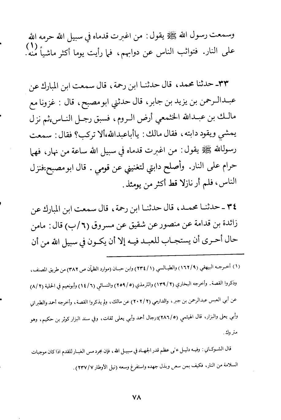 33- سَمِعْتُ ابْنُ المُبَارَكِ، عَنْ عَبْدِ الرَّحْمَنِ بْنِ يَزِيدَ بْنِ جَابِرٍ قَالَ: حَدَّثَنِي أَبُو مُصَبِّحٍ قَالَ: غَزَوْنَا مَعَ مَالِكِ بْنِ عَبْدِ اللَّهِ الْخَثْعَمِيِّ أَرْضَ الرُّومِ، فَسَبَقَ رَجُلٌ النَّاسَ، ثُمَّ نَزَلَ يَمْشِي وَيَقُودُ دَابَّتَهُ، فَقَالَ مَالِكٌ: يَا أَبَا عَبْدِ اللَّهِ، أَلاَ تَرْكَبُ؟ فَقَالَ: سَمِعْتُ رَسُولَ اللَّهِ صَلَّى اللَّهُ عَلَيْهِ وَسَلَّمَ يَقُولُ: مَنِ اغْبَرَّتْ قَدَمَاهُ فِي سَبِيلِ اللَّهِ سَاعَةً مِنْ نَهَارٍ، فَهُمَا حَرَامٌ عَلَى النَّارِ وأُصْلِحُ دَابَّتِي لِتُغْنِينِي عَنْ قَوْمِي, قَالَ أَبُو مُصَبِّحٍ: فَنَزَلَ النَّاسُ، فَلَمْ أَرَ نَازِلاً قَطُّ أَكْثَرَ مِنْ يَوْمَئِذٍ.