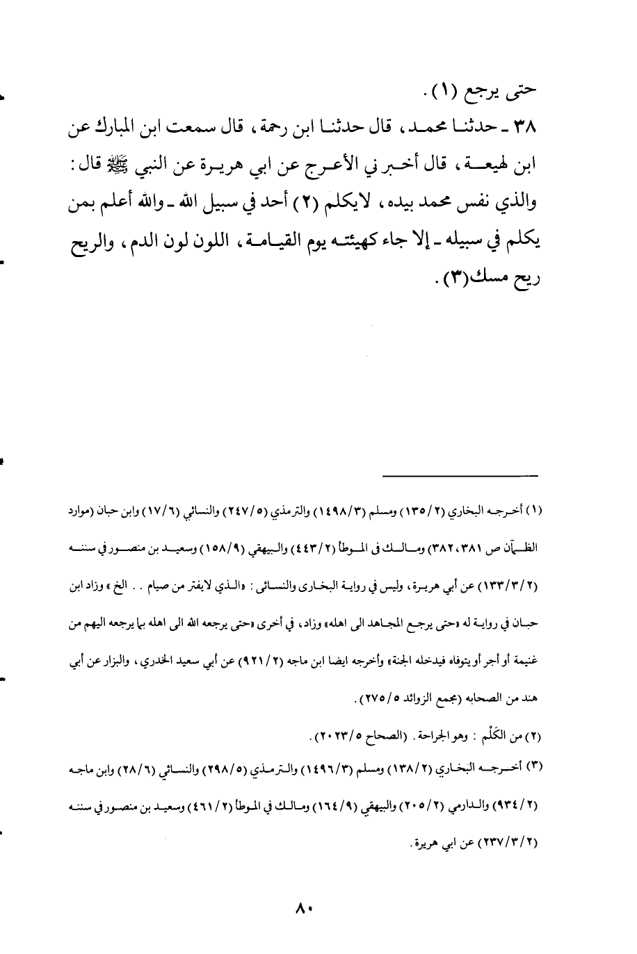 38 - سَمِعْتُ ابْنُ المُبَارَكِ، عَنِ ابْنِ لَهِيعَةَ قَالَ: أَخْبَرَنِي الأَعْرَجُ، عَنْ أَبِي هُرَيْرَةَ، عَنِ النَّبِيِّ صَلَّى اللَّهُ عَلَيْهِ وَسَلَّمَ قَالَ: وَالَّذِي نَفْسُ مُحَمَّدٍ بِيَدِهِ لاَ يُكْلَمُ أَحَدٌ فِي سَبِيلِ اللَّهِ, وَاللَّهُ أَعْلَمُ بِمَنْ يُكْلَمُ فِي سَبِيلِهِ, إِلاَّ جَاءَ كَهَيْئَتِهِ يَوْمَ الْقِيَامَةِ، اللَّوْنُ لَوْنُ الدَّمِ، وَالرِّيحُ رِيحُ مِسْكٍ.