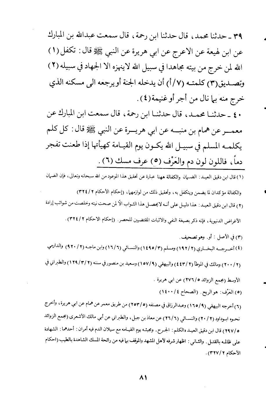40 - سَمِعْتُ ابْنُ المُبَارَكِ، عَنْ مَعْمَرٍ، عَنْ هَمَّامِ بْنِ مُنَبِّهٍ، عَنْ أَبِي هُرَيْرَةَ، عَنِ النَّبِيِّ صَلَّى اللَّهُ عَلَيْهِ وَسَلَّمَ قَالَ: كُلُّ كَلْمٍ يُكْلَمُهُ الْمُسْلِمُ فِي سَبِيلِ اللَّهِ يَكُونُ يَوْمَ الْقِيَامَةِ كَهَيْأَتِهَا، إِذَا طُعِنَتْ تُفَجِّرُ دَمًا، فَاللَّونُ لَوْنُ دَمٍ، وَالْعَرْفُ عَرْفُ مِسْكٍ.