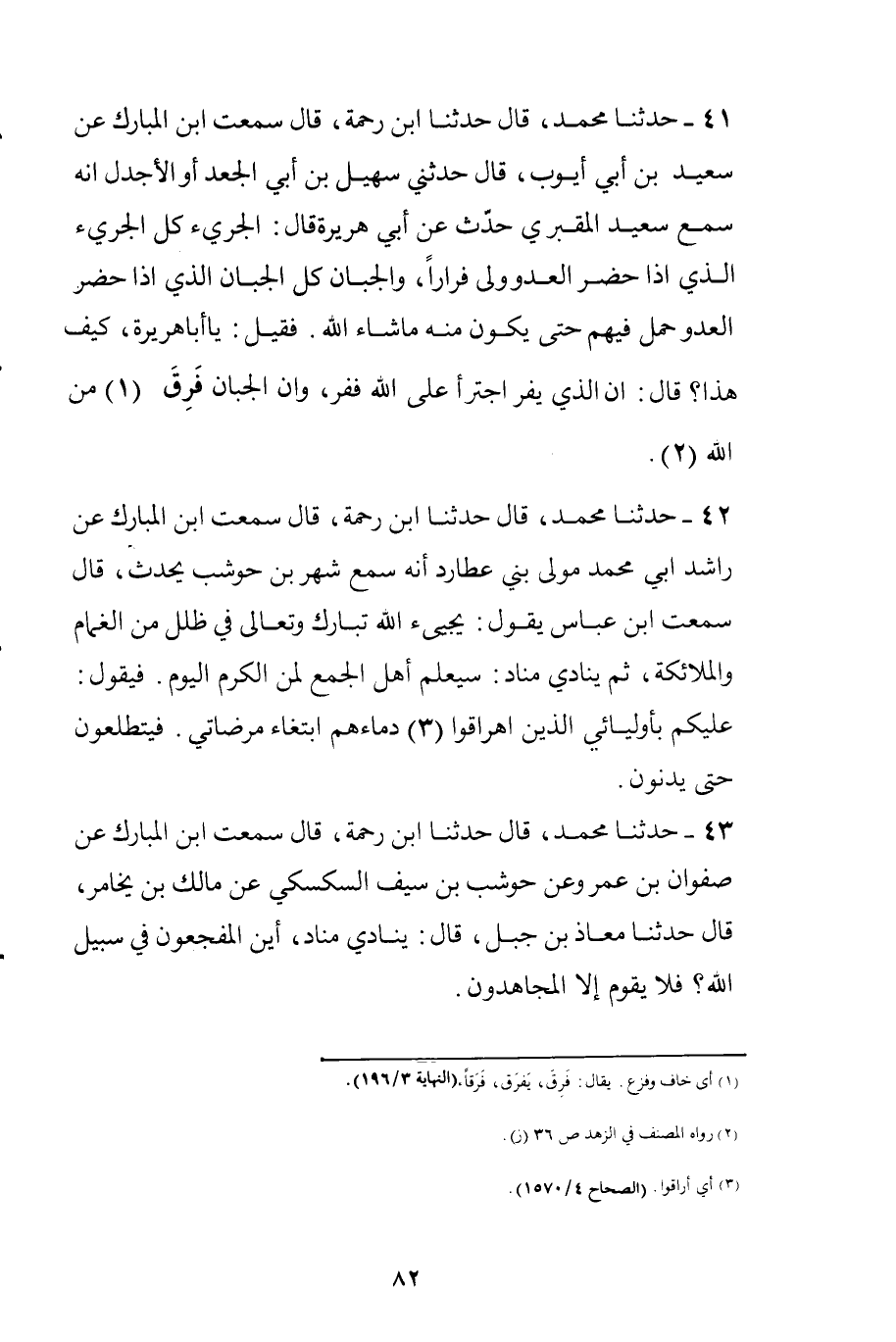 41 - سَمِعْتُ ابْنُ المُبَارَكِ، عَنْ سَعِيدِ بْنِ أَبِي أَيُّوبَ قَالَ: حَدَّثَنِي سُهَيْلُ بْنُ أَبِي الْجَعْدِ أَبُو الأَحْدَلِ (1) , أَنَّهُ سَمِعَ سَعِيدًا الْمَقْبُرِيَّ، حَدَّثَ عَنْ أَبِي هُرَيْرَةَ قَالَ: الْجَرِيءُ كُلُّ الْجَرِيءِ الَّذِي إِذَا حَضَرَ الْعَدُوَّ وَلَّى فِرَارًا, وَالْجَبَانُ كُلُّ الْجَبَانِ الَّذِي إِذَا حَضَرَ الْعَدُوَّ حَمَلَ فِيهِمْ حَتَّى يَكُونَ مِنْهُ مَا شَاءَ اللَّهُ, فَقِيلَ: يَا أَبَا هُرَيْرَةَ كَيْفَ هَذَا؟ قَالَ: إِنَّ الَّذِي يَفِرُّ اجْتَرَأَ عَلَى اللَّهِ, فَفَرَّ, وَإِنَّ الْجَبَانَ فَرِقَ مِنَ اللَّهِ.