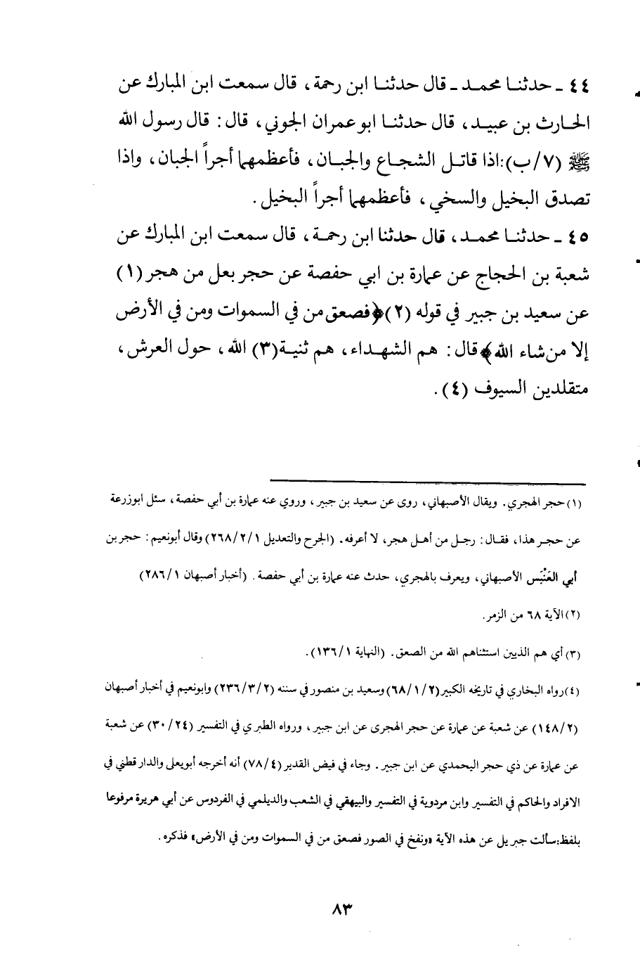 45 - سَمِعْتُ ابْنُ المُبَارَكِ، عَنْ شُعْبَةَ بْنِ الْحَجَّاجِ، عَنْ عُمَارَةَ بْنِ أَبِي حَفْصَةَ، عَنْ حُجْرٍ بَعْلٍ مِنْ هَجَرٍ, عَنْ سَعِيدِ بْنِ جُبَيْرٍ فِي قَوْلِهِ: {فَصَعِقَ مَنْ فِي السَّمَاوَاتِ وَمَنْ فِي الأَرْضِ إِلاَّ مَنْ شَاءَ اللَّهُ} قَالَ هُمُ الشُّهَدَاءُ، هُمْ ثَنِيَّةُ اللَّهِ حَوْلَ الْعَرْشِ مُتَقَلِّدِينَ السُّيُوفَ.