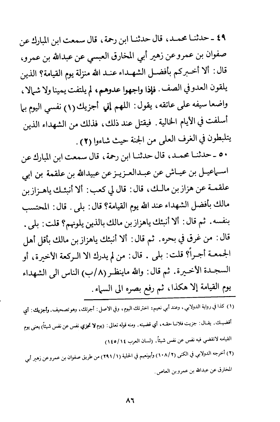 49- سَمِعْتُ ابْنُ المُبَارَكِ، عَنْ صَفْوَانَ بْنِ عَمْرٍو، عَنْ زُهَيْرٍ أَبِي الْمُخَارِقِ الْعَبْسِيِّ، عَنْ عَبْدِ اللَّهِ بْنِ عَمْرٍو قَالَ: أَلاَ أُخْبِرُكُمْ بِأَفْضَلِ الشُّهَدَاءِ عِنْدَ اللَّهِ مَنْزِلَةً يَوْمَ الْقِيَامَةِ الَّذِينَ يَلْقَوْنَ الْعَدُوَّ فِي الصَّفِّ, فَإِذَا وَاجَهُوا عَدُوَّهُمْ لَمْ يَلْتَفِتْ يَمِينًا وَلاَ شِمَالاً وَاضِعًا سَيْفَهُ عَلَى عَاتِقِهِ يَقُولُ: اللَّهُمَّ إِنِّي أُجْزِيكَ نَفْسِيَ الْيَوْمَ بِمَا أَسْلَفْتُ فِي الأَيَّامِ الْخَالِيَةِ, فَيُقْتَلُ عِنْدَ ذَلِكَ, فَذَلِكَ مِنَ الشُّهَدَاءِ الَّذِينَ يَتَلَبَّطُونَ فِي الْغُرَفِ الْعُلَى مِنَ الْجَنَّةِ حَيْثُ شَاءُوا.