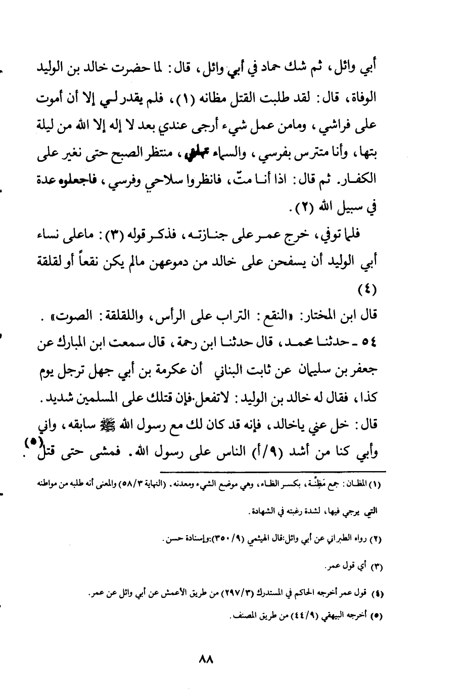 54- سَمِعْتُ ابْنُ المُبَارَكِ، عَنْ جَعْفَرِ بْنِ سُلَيْمَانَ، عَنْ ثَابِتٍ الْبُنَانِيِّ أَنَّ عِكْرِمَةَ بْنَ أَبِي جَهْلٍ تَرَجَّلَ يَوْمَ كَذَا, فَقَالَ لَهُ خَالِدُ بْنُ الْوَلِيدِ: لاَ تَفْعَلْ، فَإِنَّ قَتْلَكَ عَلَى الْمُسْلِمِينَ شَدِيدٌ, قَالَ: خَلِّ عَنِّي يَا خَالِدُ, فَإِنَّهُ قَدْ كَانَ لَكَ مَعَ رَسُولِ اللَّهِ صَلَّى اللَّهُ عَلَيْهِ وَسَلَّمَ سَابِقَةٌ, وَإِنِّي وَأَبِي كُنَّا مِنْ أَشَدِّ النَّاسِ عَلَى رَسُولِ اللَّهِ, فَمَشَى حَتَّى قُتِلَ.