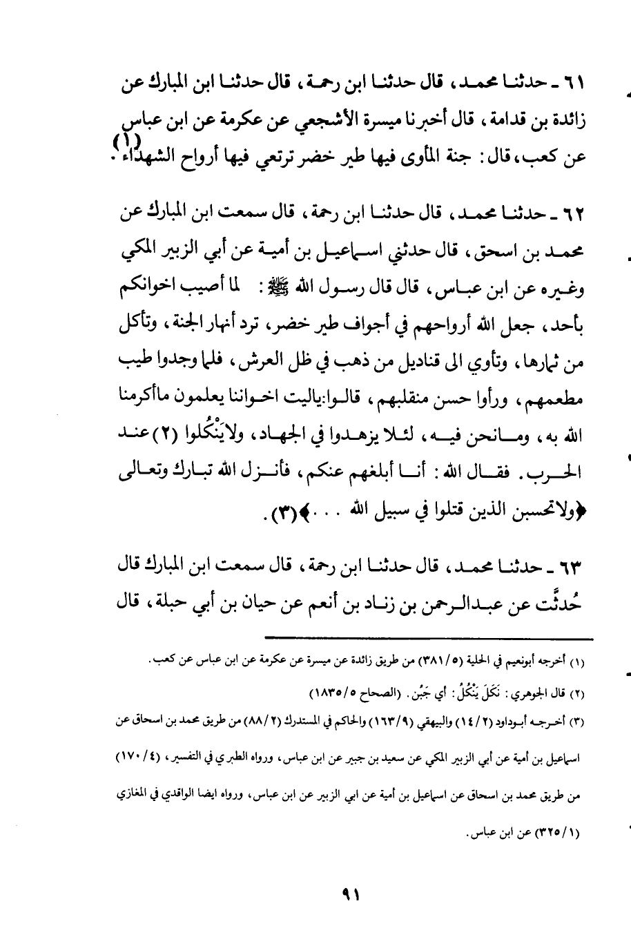62- سَمِعْتُ ابْنُ المُبَارَكِ، عَنْ مُحَمَّدِ بْنِ إِسْحَاقَ قَالَ: حَدَّثَنِي إِسْمَاعِيلُ بْنُ أُمَيَّةَ، عَنْ أَبِي الزُّبَيْرِ الْمَكِّيِّ، وَغَيْرِهِ، عَنِ ابْنِ عَبَّاسٍ قَالَ: قَالَ رَسُولُ اللَّهِ صَلَّى اللَّهُ عَلَيْهِ وَسَلَّمَ: لَمَّا أُصِيبَ إِخْوَانُكُمْ بِأُحُدٍ جَعَلَ اللَّهُ أَرْوَاحَهُمْ فِي أَجْوَافِ طَيْرٍ خُضْرٍ, تَرِدُ أَنْهَارَ الْجَنَّةِ, وَتَأْكُلُ مِنْ ثِمَارِهَا, وَتَأْوِي إِلَى قَنَادِيلَ مِنْ ذَهَبٍ فِي ظِلِّ الْعَرْشِ, فَلَمَّا وَجَدُوا طِيبَ مَطْعَمِهِمْ وَرَأَوْا حُسْنَ مُنْقَلَبِهِمْ, قَالُوا: يَالَيْتَ إِخْوَانَنَا يَعْلَمُونَ مَا أَكْرَمَنَا اللَّهُ بِهِ, وَمَا نَحْنُ فِيهِ لِئَلاَّ يَزْهَدُوا فِي الْجِهَادِ, وَلاَ يَنْكُلُوا عِنْدَ الْحَرْبِ, فَقَالَ اللَّهُ: أَنَا أُبَلِّغُهُمْ عَنْكُمْ, فَأَنْزَلَ اللَّهُ تَبَارَكَ وَتَعَالَى: {وَلاَ تَحْسَبَنَّ الَّذِينَ قُتِلُوا فِي سَبِيلِ اللَّهِ}