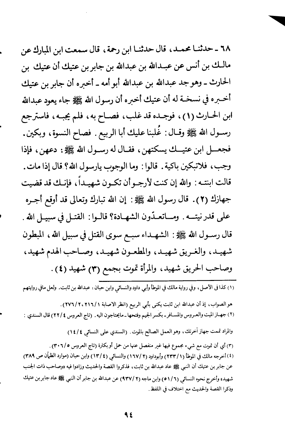 68- سَمِعْتُ ابْنُ المُبَارَكِ، عَنْ مَالِكِ بْنِ أَنَسٍ، عَنْ عَبْدِ اللَّهِ بْنِ عَبْدِ اللَّهِ بْنِ جَابِرِ بْنِ عَتِيكٍ، أَنَّ عَتِيكَ بْنَ الْحَارِثِ، وَهُوَ جَدُّ عَبْدِ اللَّهِ بْنِ عَبْدِ اللَّهِ, أَبُو أُمِّهِ أَخْبَرَهُ، أَنَّ جَابِرَ بْنَ عَتِيكٍ أَخْبَرَهُ فِي نُسْخَةٍ لَهُ, أَنَّ عَتِيك أَخْبَرَهُ, أَنَّ رَسُولَ اللَّهِ صَلَّى اللَّهُ عَلَيْهِ وَسَلَّمَ جَاءَ يَعُودُ عَبْدَ اللَّهِ بْنَ الْحَارِثِ، فَوَجَدَهُ قَدْ غَلَبَ، فَصَاحَ بِهِ, فَلَمْ يُجِبْهُ, فَاسْتَرْجَعَ رَسُولُ اللَّهِ صَلَّى اللَّهُ عَلَيْهِ وَسَلَّمَ, وَقَالَ: غُلِبْنَا عَلَيْكَ أَبَا الرَّبِيعِ, فَصَاحَ النِّسْوَةُ, وَبَكَيْنَ, فَجَعَلَ ابْنُ عَتِيكٍ يُسَكِّتُهُنَّ, فَقَالَ لَهُ رَسُولُ اللَّهِ صَلَّى اللَّهُ عَلَيْهِ وَسَلَّمَ: دَعْهُنَّ, فَإِذَا وَجَبَ, فَلاَ تَبْكِيَنَّ بَاكِيَةٌ, قَالُوا: وَمَا الْوجُوبُ يَا رَسُولَ اللَّهِ؟ قَالَ: إِذَا مَاتَ, قَالَتِ ابْنَتُهُ: وَاللَّهِ إِنْ كُنْتُ لأَرْجُو أَنْ تَكُونَ شَهِيدًا؛ فَإِنَّكَ قَدْ قَضَيْتَ جِهَازَكَ, قَالَ رَسُولُ اللَّهِ صَلَّى اللَّهُ عَلَيْهِ وَسَلَّمَ: إِنَّ اللَّهَ تَبَارَكَ وَتَعَالَى قَدْ أَوْقَعَ أَجْرَهُ عَلَى قَدْرِ نِيَّتِهِ, وَمَا تَعُدُّونَ الشَّهَادَةَ؟ قَالُوا: الْقَتْلُ فِي سَبِيلِ اللَّهِ, قَالَ رَسُولُ اللَّهِ صَلَّى اللَّهُ عَلَيْهِ وَسَلَّمَ: الشُّهَدَاءُ سَبْعٌ سِوَى الْقَتْلِ فِي سَبِيلِ اللَّهِ: الْمَبْطُونُ شَهِيدٌ, وَالْغَرِيقُ شَهِيدٌ, وَالْمَطْعُونُ شَهِيدٌ, وَصَاحِبُ الْهَدْمِ شَهِيدٌ, وَصَاحِبُ الْحَرِيقِ شَهِيدٌ, وَالْمَرْأَةُ تَمُوتُ بِجُمْعٍ شَهِيدٌ.