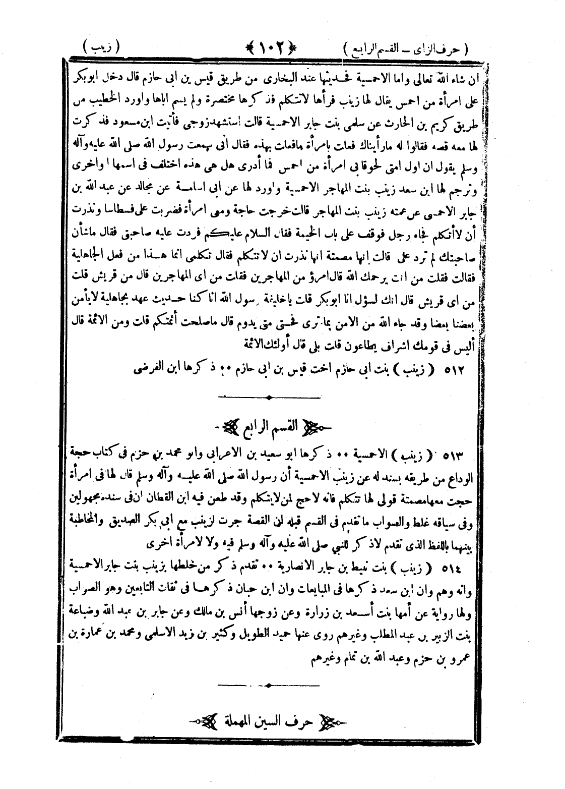 <102> إن شاء الله تعالى وأما الأحمسية فحديثها عند البخاري من طريق قيس بن أبي حازم قال دخل أبو بكر على امرأة من أحمس يقال لها زينب فرآها لا تتكلم فذكرها مختصرة ولم يسم أباها وأورد الخطيب من طريق كريم بن الحارث عن سلمى بنت جابر الأحمسية قالت استشهد زوجي فأتيت بن مسعود فذكرت لها معه قصة فقالوا له ما رأيناك فعلت بامرأة ما فعلت بهذه فقال إني سمعت رسول الله صلى الله عليه وسلم يقول إن أول أمتي لحوقا بي امرأة من أحمس انتهى فما أدري هل هي هذه اختلف في اسمها أو أخرى وترجم لها بن سعد زينب بنت المهاجر الأحمسية وأورد لها عن أبي أسامة عن مجالد عن عبد الله بن جابر الأحمسي عن عمته زينب بنت المهاجر قالت خرجت حاجة ومعي امرأة فضربت على فسطاطا ونذرت ألا أتكلم فجاء رجل فوقف على باب الخيمة فقال السلام عليكم فردت عليه صاحبتي فقال ما شأن صاحبتك لم ترد علي قالت إنها مصمتة إنها نذرت ألا تتكلم فقال تكلمي إنما هذا من فعل الجاهلية فقالت فقلت من أنت يرحمك الله قال امرؤ من المهاجرين فقلت من أي المهاجرين قال من قريش قلت من أي قريش قال إنك لسئول أنا أبو بكر قلت يا خليفة رسول الله إنا كنا حديثي عهد بجاهلية لا يأمن بعضنا بعضا وقد جاء الله من الأمر بما ترى فحتى متى يدوم قال ما صلحت أئمتكم قلت ومن الأئمة قال أليس في قومك أشراف يطاعون قلت بلى قال أولئك الأئمة زينب بنت أبي حازم أخت قيس بن أبي حازم ذكرها بن الفرضي القسم الرابع زينب الأحمسية ذكرها أبو سعيد بن الأعرابي وأبو محمد بن حزم في كتاب حجة الوداع من طريقه بسند له عن زينب الأحمسية أن رسول الله صلى الله عليه وسلم قال لها في امرأة حجت معها مصمتة قولي لها تتكلم فإنه لا حج لمن لا يتكلم وقد طعن فيه بن القطان أن في سنده مجهولين وفي سياقه غلط والصواب ما تقدم في القسم قبله أن القصة جرت لزينب مع أبي بكر الصديق والمخاطبة بينهما باللفظ الذي تقدم لا ذكر للنبي صلى الله عليه وسلم فيه ولا لامرأة أخرى زينب بنت نبيط بن جابر الأنصارية تقدم ذكر من خلطها بزينب بنت جابر الأحمسية وأنه وهم وأن بن سعد ذكرها في المبايعات وأن بن حبان ذكرها في ثقات التابعين هو الصواب ولها رواية عن أمها بنت أسعد بن زرارة وعن وزجها أنس بن مالك وعن جابر بن عبد الله وضباعة بنت الزبير بن عبد المطلب وغيرهم روى عنها حميد الطويل وكثير بن زيد الأسلمي ومحمد بن عمارة بن عمرو بن حزم وعبد الله بن تمام وغيرهم