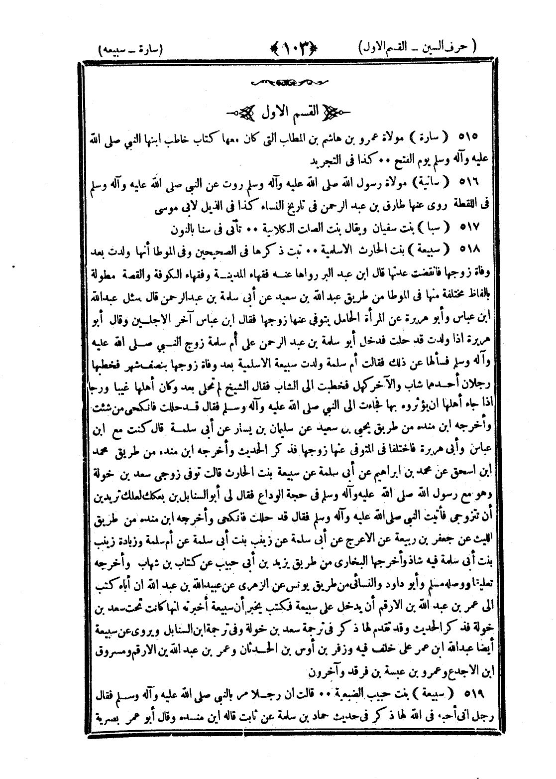 <103> القسم الأول سارة مولاة عمرو بن هاشم بن المطلب التي كان معها كتاب حاطب أمنها النبي صلى الله عليه وسلم يوم الفتح كذا في التجريد سارية الجمحية ذكرها الديلمي في الفردوس ثلاثة لقيتهم المهيمص والجعدر والكاهن قلت ولم يخرجه ولده ولا وقفت له على إسناد سائبة مولاة رسول الله صلى الله عليه وسلم روت عن النبي صلى الله عليه وسلم في اللقطة روى عنها طارق بن عبد الرحمن في تاريخ النساء كذا في الذيل لأبي موسى سبا بنت سفيان ويقال بنت الصلت الكلابية تأتي في سنا بالنون سبيعة بنت الحارث الأسلمية ثبت ذكرها في الصحيحين وفي الموطأ أنها ولدت بعد وفاة زوجها فانقضت عدتها قال بن عبد البر روى عنها فقهاء المدينة وفقهاء الكوفة والقصة مطولة بألفاظ مختلفة منها في الموطأ من طريق عبد ربه بن سعيد عن أبي سلمة بن عبد الرحمن قال سئل عبد الله بن عباس وأبو هريرة عن المرأة الحامل يتوفى عنها زوجها فقال بن عباس آخر الأجلين وقال أبو هريرة إذا ولدت فقد حلت فدخل أبو سلمة بن عبد الرحمن على أم سلمة زوج النبي صلى الله عليه وسلم فسألها عن ذلك فقالت أم سلمة ولدت سبيعة الأسلمية بعد وفاة زوجها بنصف شهر فخطبها رجلان أحدهما شاب والآخر كهل فخطبت إلى الشاب فقال الشيخ لم تحلي بعد وكان أهلها غيبا ورجا إذا جاء أهلها أن يؤثره بها فجاءت إلى النبي صلى الله عليه وسلم فقال قد حللت فانكحي من شئت وأخرجه بن مندة من طريق يحيى بن سعيد عن سليمان بن يسار عن أبي سلمة قال كنت مع بن عباس وأبي هريرة فاختلفا في المتوفى عنها زوجها فذكر الحديث وأخرجه بن مندة من طريق محمد بن إسحاق عن محمد بن إبراهيم عن أبي سلمة عن سبيعة بنت الحارث قالت توفى زوجي سعد بن خولة وهو مع رسول الله صلى الله عليه وسلم في حجة الوداع فقال لي أبو السنابل بن بعكك لعلك تريدين أن تتزوجي فأتيت النبي صلى الله عليه وسلم فقال قد حللت فانكحي وأخرجه بن مندة من طريق الليث عن جعفر بن ربيعة عن الأعرج عن أبي سلمة عن زينب بنت أبي سلمة عن أم سلمة وزيادة زينب بنت أبي سلمة فيه شاذة وأخرجها البخاري من طريق يزيد بن أبي حبيب عن كتاب بن شهاب وأخرجه تعليقا ووصله مسلم وأبو داود والنسائي من طريق يونس عن الزهري عن عبيد الله بن عبد الله أن أباه كتب إلى عمر بن عبد الله بن الأرقم يأمره أن يدخل على سبيعة فكتب يخبر أن سبيعة أخبرته أنها كانت تحت سعد بن خولة فذكر الحديث وقد تقدم لها ذكر في ترجمة سعد بن خولة وفي ترجمة أبي السنابل ويروي عن سبيعة أيضا عبد الله بن عمر على خلف فيه وزفر بن أوس بن الحدثان وعمر بن عبد الله بن الأرقم ومسروق بن الأجدع وعمرو بن عتبة بن فرقد وآخرون سبيعة بنت حبيب الضبعية قالت إن رجلا مر بالنبي صلى الله عليه وسلم فقال رجل أني أحبه في الله لها ذكر في حديث حماد بن سلمة عن ثابت قاله بن مندة وقال أبو عمر بصرية §