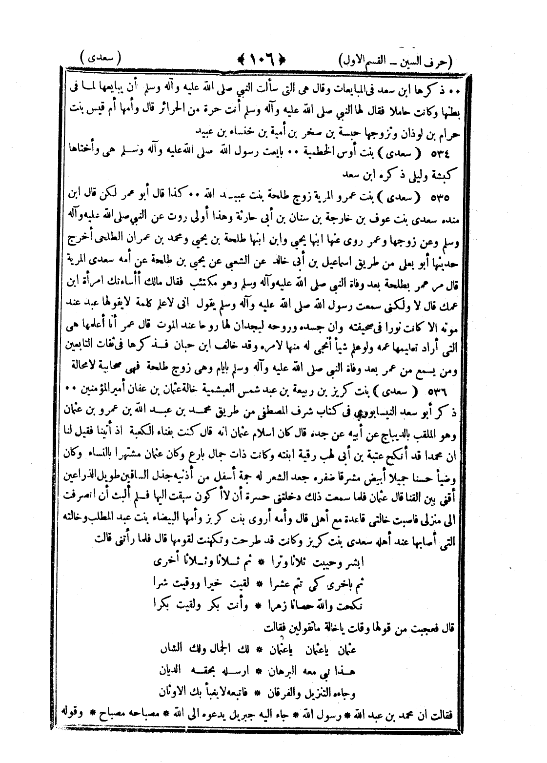 <106> ذكرها بن سعد في المبايعات وقال هي التي سألت النبي صلى الله عليه وسلم أن يبايعها لما في بطنها وكانت حاملا فقال لها النبي صلى الله عليه وسلم أنت حرة من الحرائر قال وأمها أم قيس بنت حرام بن لوذان وتزوجها حسنة بن صخر بن أمية بن خنساء بن عبيد سعدى بنت أوس الخطمية بايعت رسول الله صلى الله عليه وسلم هي وأختاها كبشة وليلى ذكره بن سعد سعدى بنت عمرو المرية زوج طلحة بن عبيد الله كذا قال أبو عمر لكن قال بن مندة سعدى بنت عوف بن خارجة بن سنان بن أبي حارثة وهذا أولى روت عن النبي صلى الله عليه وسلم وعن زوجها وعمر روى عنها ابنها يحيى وابن ابنها طلحة بن يحيى ومحمد بن عمران الطلحي أخرج حديثها أبو يعلى من طريق إسماعيل بن أبي خالد عن الشعبي عن يحيى بن طلحة عن أمه سعدى المرية قال مر عمر بطلحة بعد وفاة النبي صلى الله عليه وسلم وهو مكتئب فقال ما لك أأساءتك امرأة بن عمك قال لا ولكني سمعت رسول الله صلى الله عليه وسلم يقول إني لأعلم كلمة لا يقولها عبد عند موته إلا كانت نورا في صحيفته وإن جسده وروحه ليجدان لها روحا عند الموت قال عمر أنا أعلمها هي التي أراد تعليمها عمه ولو علم شيئا أنجى له منها لأمره وقد خالف بن حبان فذكرها في ثقات التابعين ومن يسمع من عمر بعد وفاة النبي صلى الله عليه وسلم بأيام وهي زوج طلحة فهي صحابية لا محالة سعدى بنت كرز بن ربيعة بن عبد شمس العبشمية خالة عثمان بن عفان أمير المؤمنين ذكر أبو سعد النيسابوري في كتاب شرف المصطفى من طريق محمد بن عبد الله بن عمرو بن عثمان وهو الملقب بالديباج عن أبيه عن جده قال كان إسلام عثمان أنه قال كنت بفناء الكعبة إذ أتينا فقيل لنا إن محمدا قد أنكح عتبة بن أبي لهب رقية ابنته وكانت ذات جمال بارع وكان عثمان مشتهرا بالنساء وكان وضيئا حسنا جميلا أبيض مشربا صفرة جعد الشعر له جمة أسفل من أذنيه جذل الساقين طويل الذراعين أقنى بين القنا قال عثمان فلما سمعت ذلك دخلتني حسرة ألا أكون سبقت إليها فلم ألبث أن انصرفت إلى منزلي فأصبت خالتي قاعدة مع أهلي قال وأمه أروى بنت كريز وأمها البيضاء بنت عبد المطلب وخالته التي أصابها عند أهله سعدى بنت كرز وكانت قد طرقت وتكهنت لقومها قال فلما رأتني قالت أبشر وحييت ثلاثا وترا ثم ثلاثا وثلاثا أخرى ثم بأخرى كي تتم عشرا لقيت خيرا ووقيت شرا نكحت والله حصانا زهرا وأنت بكر ولقيت بكرا قال فعجبت من قولها وقلت يا خالة ما تقولين فقالت عثمان يا عثمان يا عثمان لك الجمال ولك الشان هذا نبي معه البرهان أرسله بحقه الديان وجاء التنزيل والفرقان فاتبعه لا تغيا بك الأوثان فقالت إن محمد بن عبد الله رسول الله جاء إليه يدعوه إلى الله مصباحه مصباح وقوله §