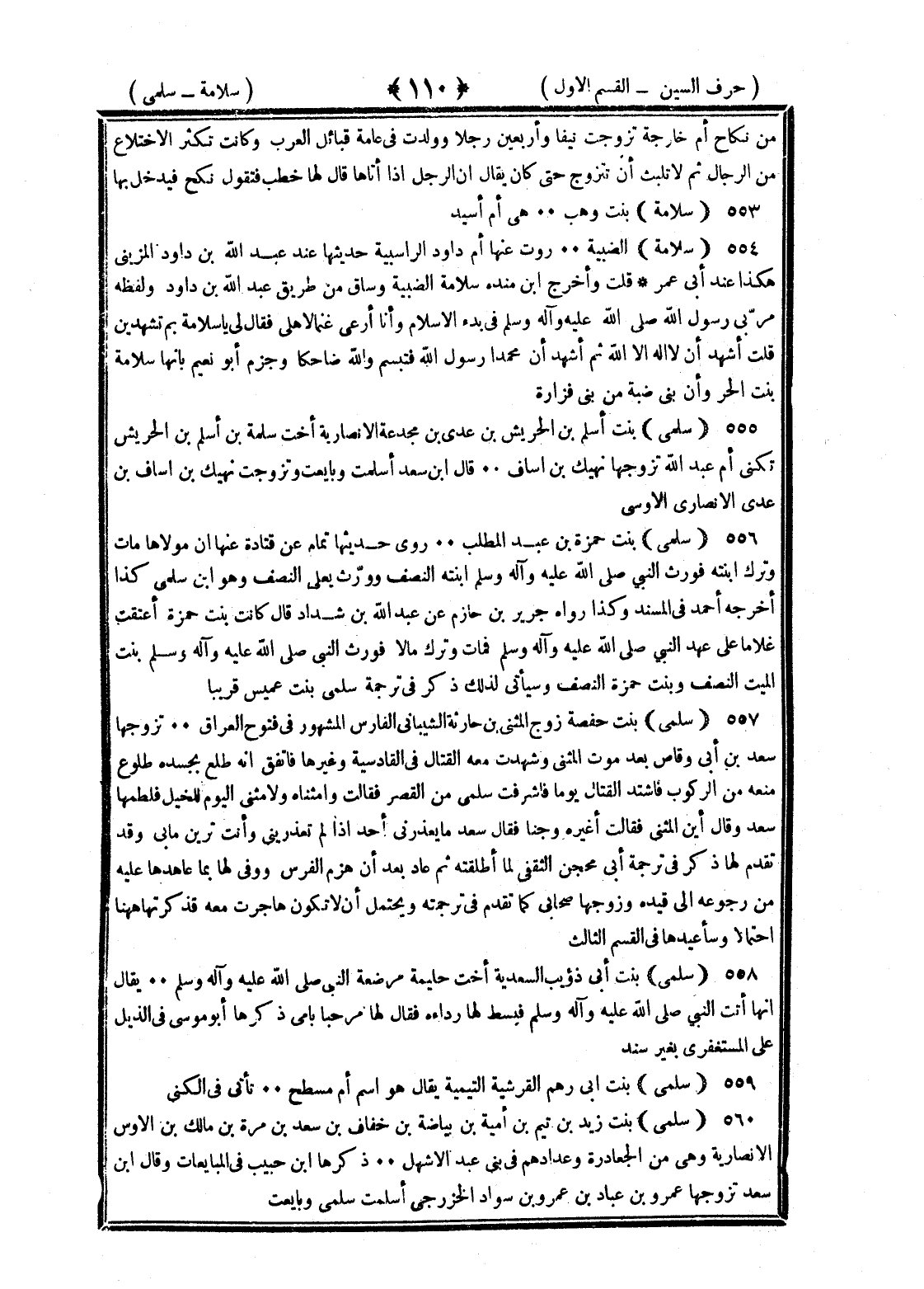 <110> من نكاح أم خارجة تزوجت نيفا وأربعين رجلا وولدت في عامة قبائل العرب وكانت تكثر الإختلاع من الرجال ثم لا تلبث أن تتزوج حتى كان يقال إن الرجل إذا أتاها قال لها خطب فتقول نكح فيدخل بها سلامة بنت وهب هي أم أسيد سلامة الضبية روت عنها أم داود الراسبية حديثها عند عبد الله بن داود المزني هكذا عند أبي عمر قلت وأخرج بن مندة سلامة الضبية وساق من طريق عبد الله بن داود ولفظه مر بي رسول الله صلى الله عليه وسلم في بدء الإسلام وأنا أرعى غنما لأهلي فقال لي يا سلامة بم تشهدين قلت أشهد أن لا إله إلا الله ثم أشهد أن محمدا رسول الله فتبسم والله ضاحكا وجزم أبو نعيم بأنها بنت الحر وأن بني ضبة من بني فزارة سلمى بنت أسلم بن الحريش بن عدي بن مجدعة الأنصارية أخت سلمة بن أسلم بن الحريش تكنى أم عبد الله تزوجها نهيك بن إساف قال بن سعد أسلمت وبايعت وتزوجت نهيك بن إساف بن عدي الأنصاري الأوسي سلمى بنت حمزة بن عبد المطلب روى حديثها تمام عن قتادة عنها أن مولاها مات وترك ابنته فورث النبي صلى الله عليه وسلم ابنته النصف وورث يعلى النصف وهو بن سلمى كذا أخرجه أحمد في المسند وكذا رواه جرير بن حازم عن عبد الله بن شداد قال كانت بنت حمزة أعتقت غلاما على عهد النبي صلى الله عليه وسلم فمات وترك مالا فورث النبي صلى الله عليه وسلم بنت الميت النصف وبنت حمزة النصف وسيأتي لذلك ذكر في ترجمة سلمى بنت عميس قريبا سلمى بنت حفصة زوج المثنى بن حارثة الشيباني الفارس المشهور في فتوح العراق تزوجها سعد بن أبي وقاص بعد موت المثنى وشهدت معه القتال في القادسية وغيرها فاتفق أنه طلع بجسده طلوع منعه من الركوب فاشتد القتال يوما فأشرفت سلمى من القصر فقالت وامثناه ولا مثنى اليوم للخيل فلطمها سعد وقال أين المثنى فقالت أغيرة وجبنا فقال سعد ما يعذرني أحد إذا لم تعذريني وأنت ترين ما بي وقد تقدم لها ذكر في ترجمة أبي محجن الثقفي لما أطلقته ثم عاد بعد أن هزم الفرس ووفى لها بما عاهدها عليه من رجوعه الى قيده وزوجها صحابي كما تقدم في ترجمته ويحتمل ألا تكون هاجرت معه فذكرها احتمالا وسأعيدها في القسم الثالث سلمى بنت أبي ذؤيب السعدية أخت حليمة مرضعة النبي صلى الله عليه وسلم يقال إنها أتت النبي صلى الله عليه وسلم فبسط لها رداءه وقال لها مرحبا بأمي ذكرها أبو موسى في الذيل عن المستغفري بغير سند سلمى بنت أبي رهم القرشية التيمية يقال هو اسم أم مسطح تأتي في الكنى سلمى بنت زيد بن تيم بن أمية بن بياضة بن خفاف بن سعد بن مرة بن مالك بن الأوس الأنصارية وهي من الجعادرة وعدادهم في بني عبد الأشهل ذكرها بن حبيب في المبايعات وقال بن سعد تزوجها عمرو بن عباد بن عمرو بن سواد الخزرجي أسلمت سلمى وبايعت §