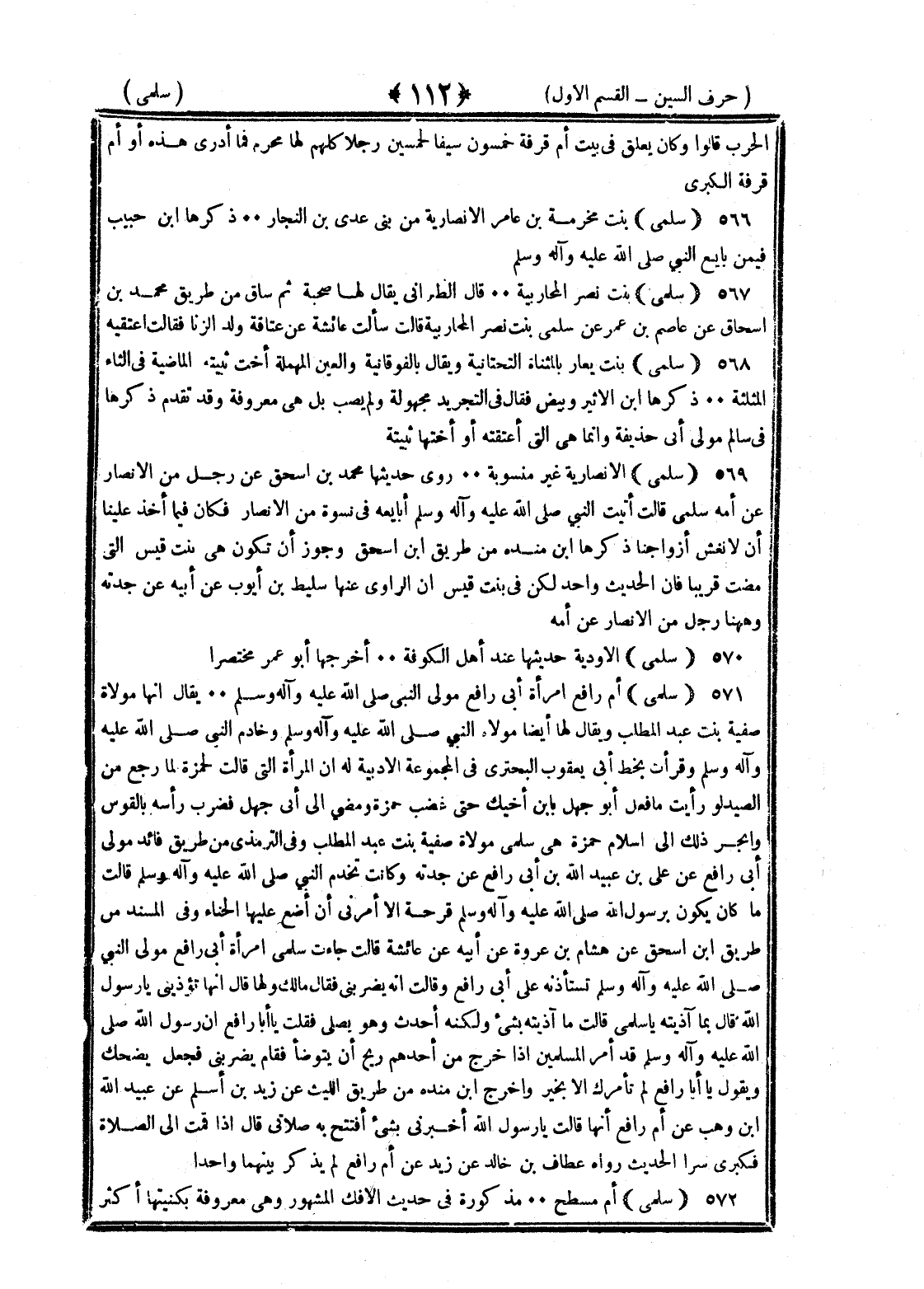 <112> الحوأب قالوا وكان يعلق في بيت أم قرفة خمسون سيفا لخمسين رجلا كلهم لها محرم فما أدري هذه أو أم قرفة الكبرى سلمى بنت محرز بن عامر الأنصارية من بني عدي بن النجار ذكرها بن حبيب فيمن بايع النبي صلى الله عليه وسلم سلمى بنت نصر المحاربية قال الطبراني يقال لها صحبة ثم ساق من طريق محمد بن إسحاق عن عاصم بن عمر عن سلمى بنت نصر المحاربية قالت سألت عائشة عن عتاقة ولد الزنا فقالت أعتقيه سلمى بنت يعار بالمثناة التحتانية ويقال بالفوقانية والعين المهملة أخت ثبيتة الماضية في الثناء المثلثة ذكرها بن الأثير وبيض فقال في التجريد مجهولة ولم يصب بل هي معروفة وقد تقدم ذكرها في سالم مولى أبي حذيفة وإنما هي التي أعتقته أو أختها ثبيتة سلمى الأنصارية غير منسوبة روى حديثها محمد بن إسحاق عن رجل من الأنصار عن أمة سلمى قالت أتيت النبي صلى الله عليه وسلم أبايعه في نسوة من الأنصار فكان فيما أخذ علينا ألا نغش أزواجنا ذكرها بن منده من طريق بن إسحاق وجوز أن تكون هي بنت قيس التي مضت قريبا فإن الحديث واحد لكن في بنت قيس إن الراوي عنها سليط بن أيوب عن أبيه عن جدته وههنا رجل من الأنصار عن أمه سلمى الأودية حديثها عند أهل الكوفة أخرجه أبو عمر مختصرا سلمى أم رافع امرأة أبي رافع مولى النبي صلى الله عليه وسلم يقال إنها مولاة صفية بنت عبد المطلب ويقال لها أيضا مولاة النبي صلى الله عليه وسلم وخادم النبي صلى الله عليه وسلم وقرأت بخط أبي يعقوب البختري في المجموعة الأدبية له إن المرأة التي قالت لحمزة لما رجع من الصيد لو رأيت ما فعل أبو جهل بابن أخيك حتى غضب حمزة ومضى الى أبي جهل فضرب رأسه بالقوس وانجر ذلك الى إسلام حمزة هي سلمى مولاة صفية بنت عبد المطلب وفي الترمذي من طريق فائد مولى أبي رافع عن علي بن عبيد الله بن أبي رافع عن جدته وكانت تخدم النبي صلى الله عليه وسلم قالت ما كان يكون برسول الله صلى الله عليه وسلم قرحة إلا أمرني أن أضع عليها الحناء وفي المسند من طريق بن إسحاق عن هشام بن عروة عن أبيه عن عائشة قالت جاءت سلمى امرأة أبي رافع مولى النبي صلى الله عليه وسلم تستأديه على أبي رافع وقالت إنه يضربني فقال مالك ولها قال إنها تؤذيني يا رسول الله قال بم آذيته يا سلمى قالت ما آذيته بشيء ولكنه أحدث وهو يصلي فقلت يا أبا رافع إن رسول الله صلى الله عليه وسلم قد أمر المسلمين إذا خرج من أحدهم ريح أن يتوضأ فقام يضربني فجعل يضحك ويقول يا أبا رافع لم تأمرك إلا بخير وأخرج بن منده من طريق الليث عن زيد بن أسلم عن عبيد الله بن وهب عن أم رافع أنها قالت يا رسول الله أخبرني بشيء أفتتح به صلاتي قال إذا قمت الى الصلاة فكبري سرا الحديث رواه عطاف بن خالد عن زيد عن أم رافع ولم يذكر بينهما واحدا سلمى أم مسطح مذكورة في حديث الإفك المشهور وهي معروفة بكنيتها أكثر §