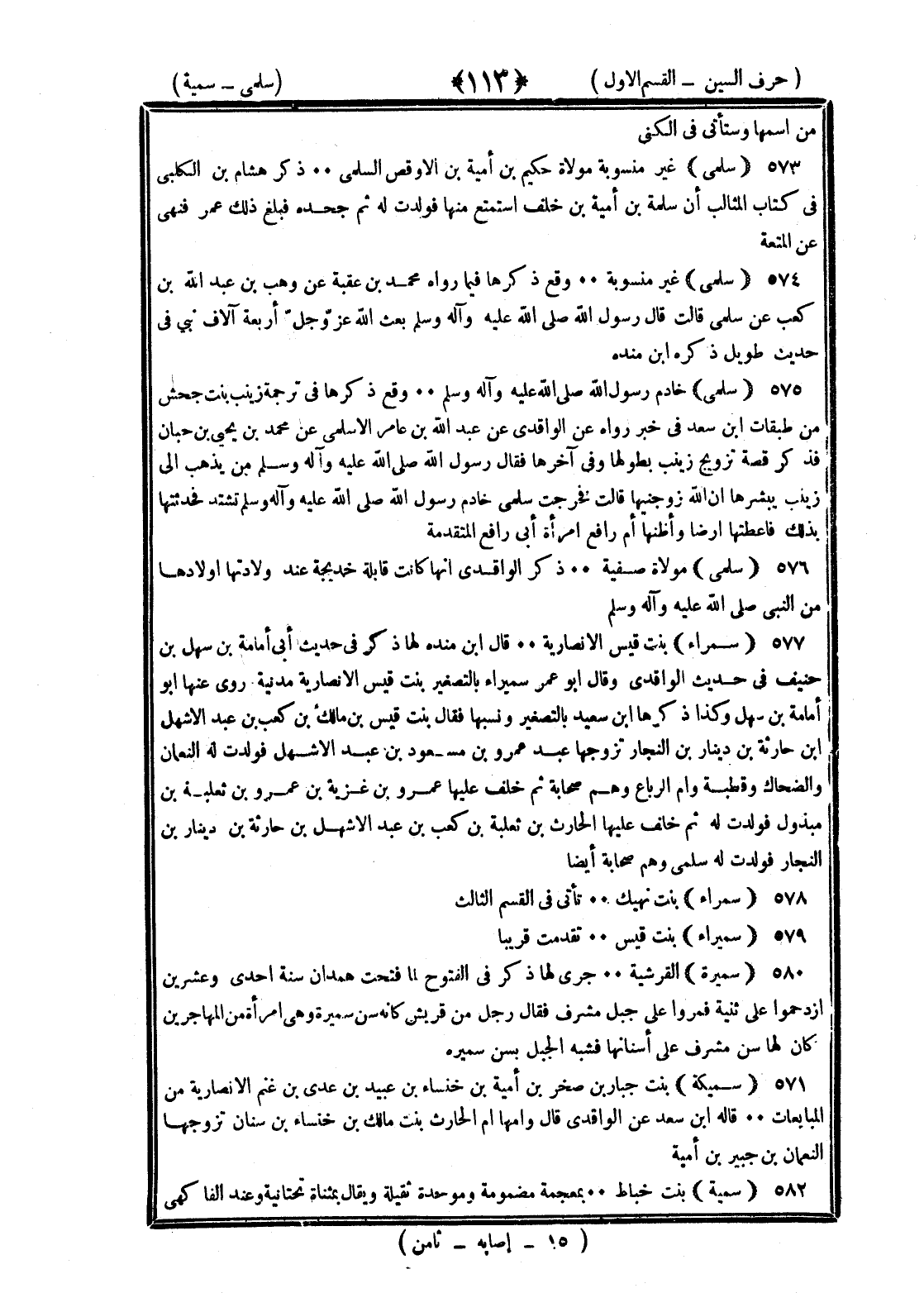 <113> من اسمها وستأتي في الكنى سلمى غير منسوبة مولاة حكيم بن أمية بن الأوقص السلمي ذكر هشام بن الكلبي في كتاب المثالب أن سلمة بن أمية بن خلف استمتع منها فولدت له ثم جحدة فبلغ ذلك عمر فنهى عن المتعة سلمى غير منسوبة وقع ذكرها فيما رواه محمد بن عقبة عن وهب بن عبد الله بن كعب عن سلمى قالت قال رسول الله صلى الله عليه وسلم بعث الله عز وجل أربعة آلاف نبي في حديث طويل ذكره بن منده سلمى خادم رسول الله صلى الله عليه وسلم وقع ذكرها في ترجمة زينب بنت جحش من طبقات بن سعد في خبر رواه عن الواقدي عن عبد الله بن عامر الأسلمي عن محمد بن يحيى بن حبان فذكر قصة تزويج زينب بطولها وفي آخرها فقال رسول الله صلى الله عليه وسلم من يذهب الى زينب يبشرها أن الله زوجنيها قالت فخرجت سلمى خادم رسول الله صلى الله عليه وسلم تشتد فحدثتها بذلك فأعطتها أرضا وأظنها أم رافع امرأة أبي رافع المتقدمة سلمى مولاة صفية ذكر الواقدي أنها كنت قابلة خديجة عند ولادتها أولادها من النبي صلى الله عليه وسلم سمراء بنت قيس الأنصارية قال بن منده لها ذكر في حديث أبي أمامة بن سهل بن حنيف في حديث الواقدي وقال أبو عمر سميراء بالتصغير بنت قيس الأنصارية مدنية روى عنها أبو أمامة بن سهل وكذا ذكرها بن سعد بالتصغير ونسبها فقال بنت قيس بن مالك بن كعب بن عبد الأشهل بن حارثة بن دينار بن النجار تزوجها عبد عمرو بن عبد الأشهل فولدت له النعمان والضحاك وقطبة وأم الرياع وهم صحابة ثم خلف عليها عمرو بن غزية بن عمرو بن ثعلبة بن مبذول فولدت له ثم خلف عليها الحارث بن ثعلبة بن كعب بن عبد الأشهل بن حارثة بن دينار بن النجار فولدت له سلمى وهم صحابة أيضا سمراء بنت نهيك تأتي في القسم الثالث سميراء بنت قيس تقدمت قريبا سميرة القرشية جرى لها ذكر في الفتوح لما فتحت همذان سنة إحدى وعشرين ازدحموا على ثنية فمروا على جبل مشرف فقال رجل من قريش كأنه من سميرة وهي امرأة من المهاجرين كان لها سن مشرفة على أسنانها فشبه الجبل بسن سميرة سميكة بنت جبار بن صخر بن أمية بن خنساء بن عبيد بن عدي بن غنم الأنصارية من المبايعات قاله بن سعد عن الواقدي قال وأمها أم الحارث بنت مالك بن خنساء بن سنان تزوجها النعمان بن جبير بن أمية سمية بنت خباط بمعجمة مضمومة وموحدة ثقيلة ويقال بمثناة تحتانية وعند الفاكهي §